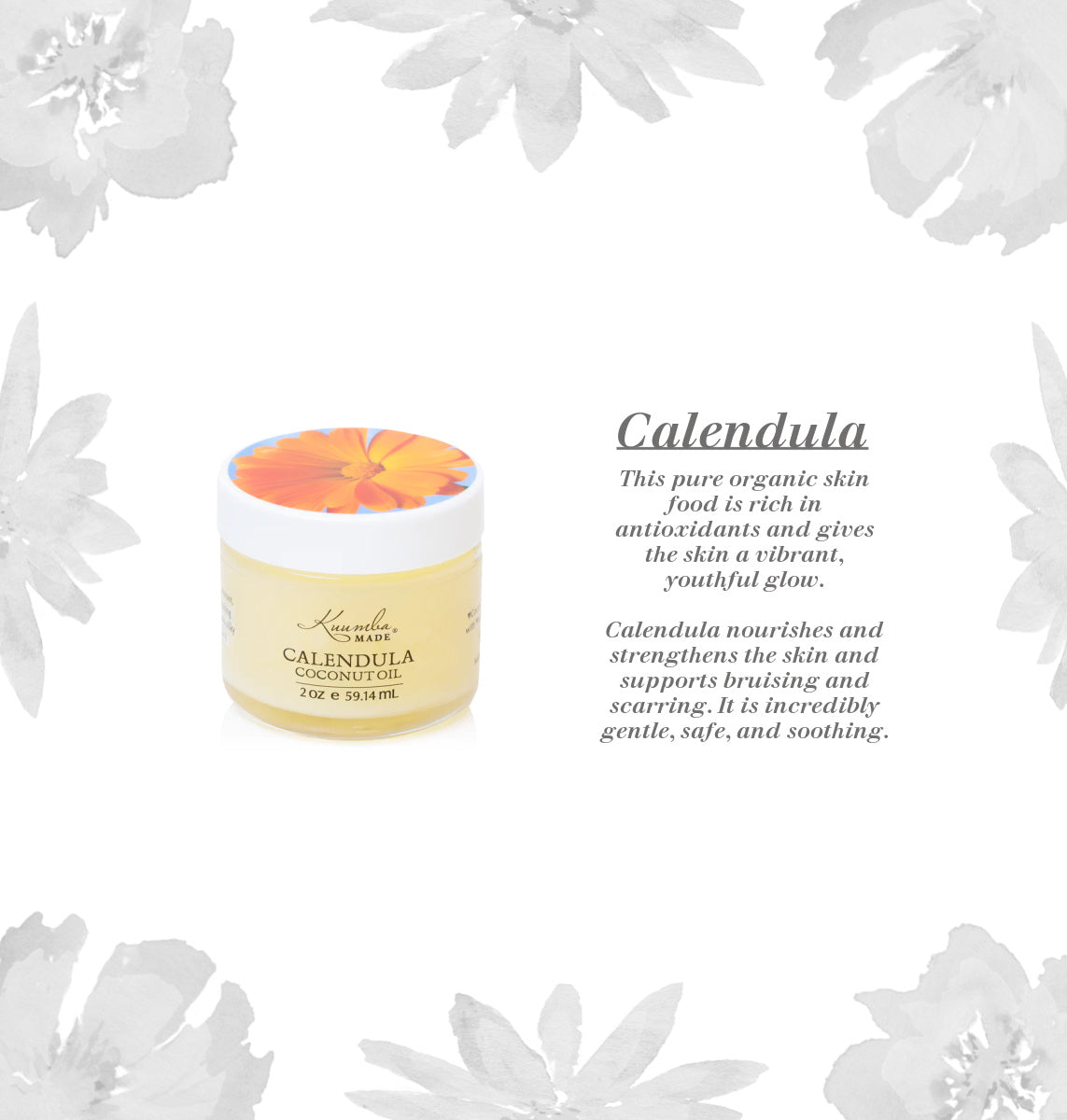 Calendula ~ Calendula nourishes and strengthens the skin and supports bruising and scarring. It is incredibly gentle, safe, and soothing.