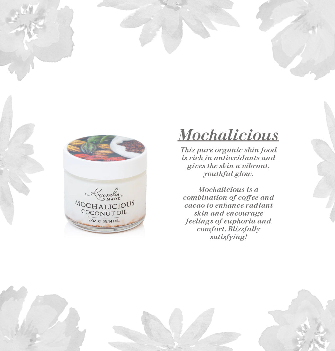 Mochalicious ~ Mochalicious is a combination of coffee and cacao to enhance radiant skin and encourage feelings of euphoria and comfort. Blissfully satisfying!