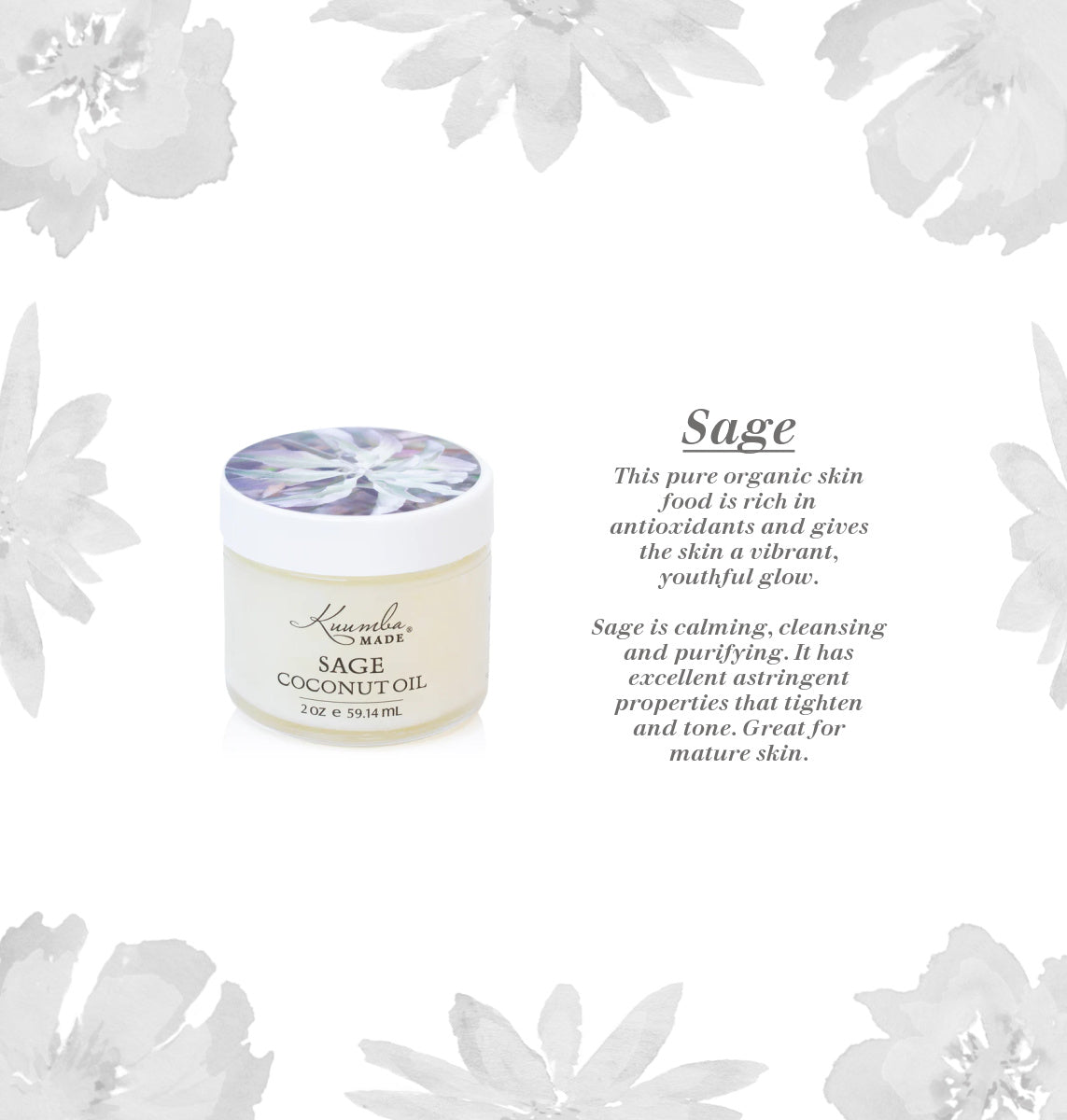 Sage ~ Sage is calming, cleansing and purifying. It has excellent astringent properties that tighten and tone. Great for mature skin.