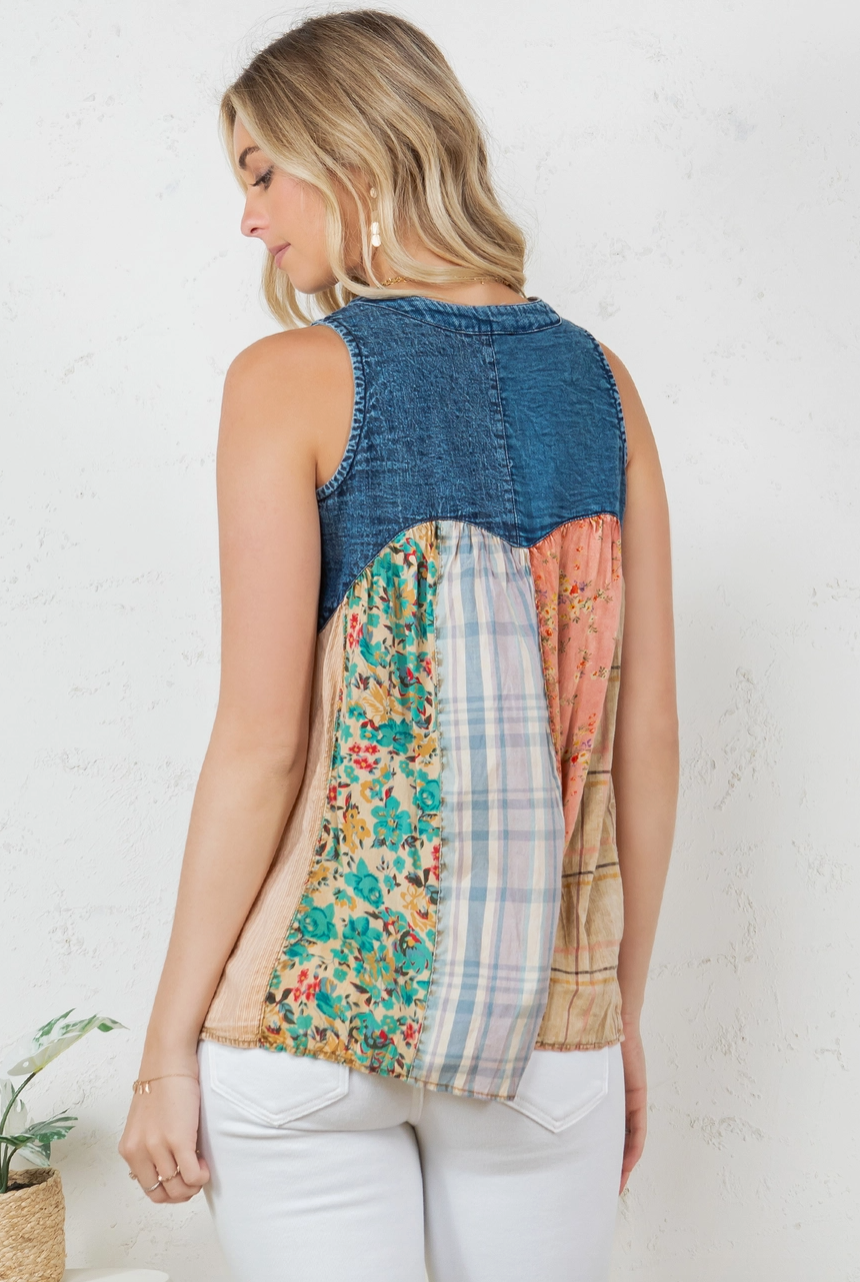 This Artistic Patchwork V-Neck in Denim is the perfect staple piece to add to your closet, and or any on-trend bohemian style outfit! Features a V-neck and a button down front. This top is perfect for any on trend bohemian style outfit and is the perfect piece for any season!