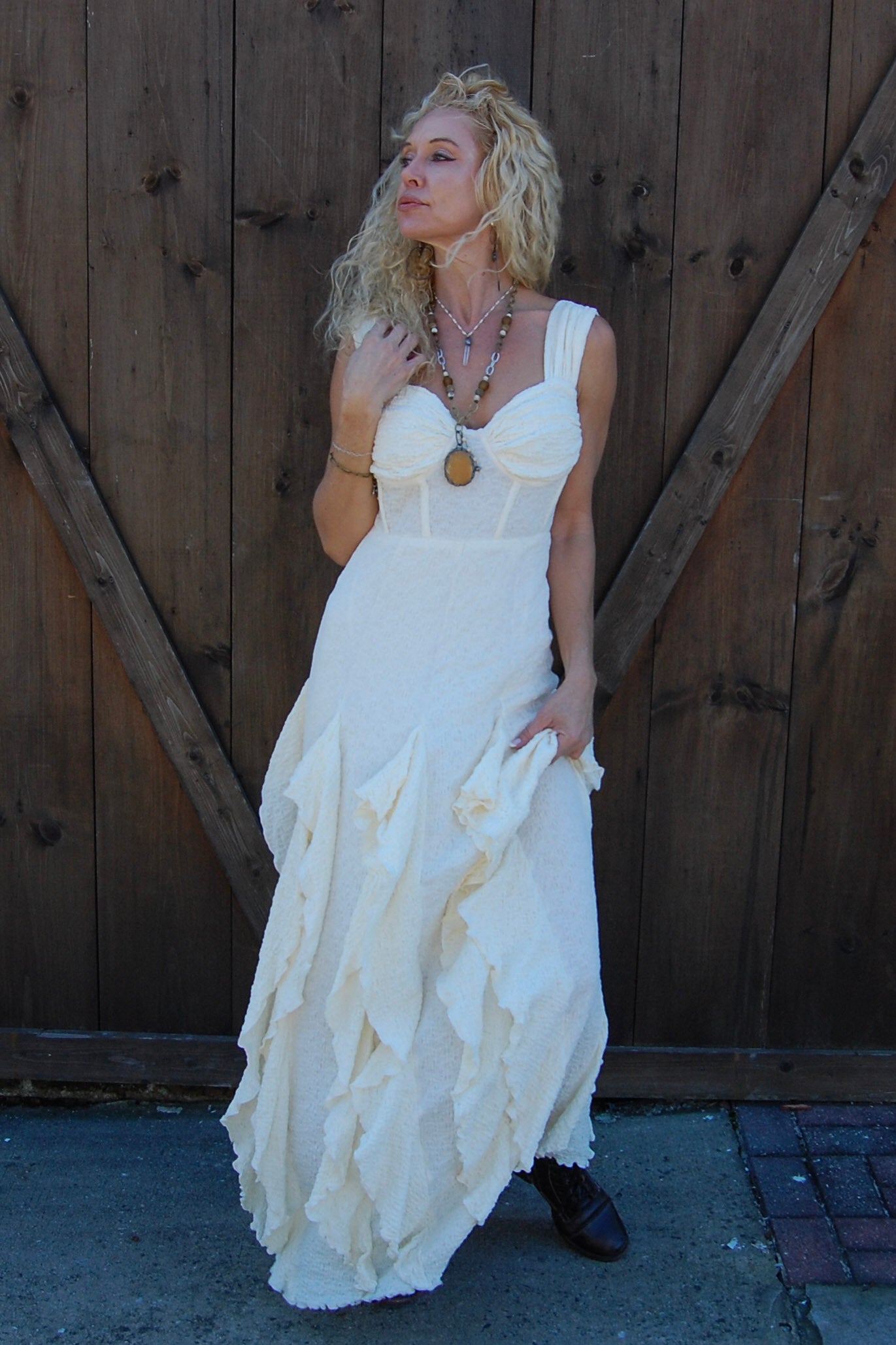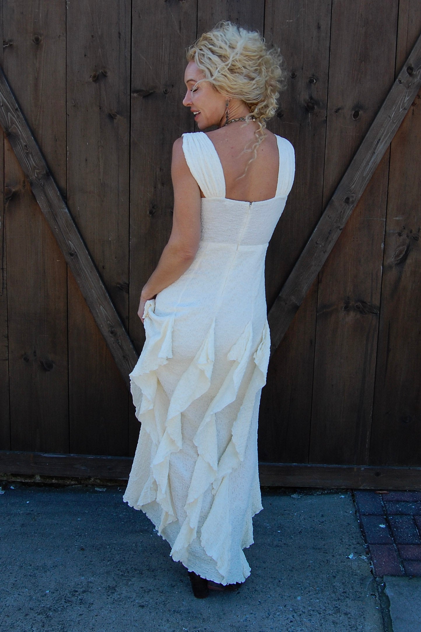 This Romie Ruffle Maxi Dress in Ivory contents contain 80% Cotton, 10% Nylon and 10% Spandex material. Total body length (shoulder to bottom) measures 60 inches.