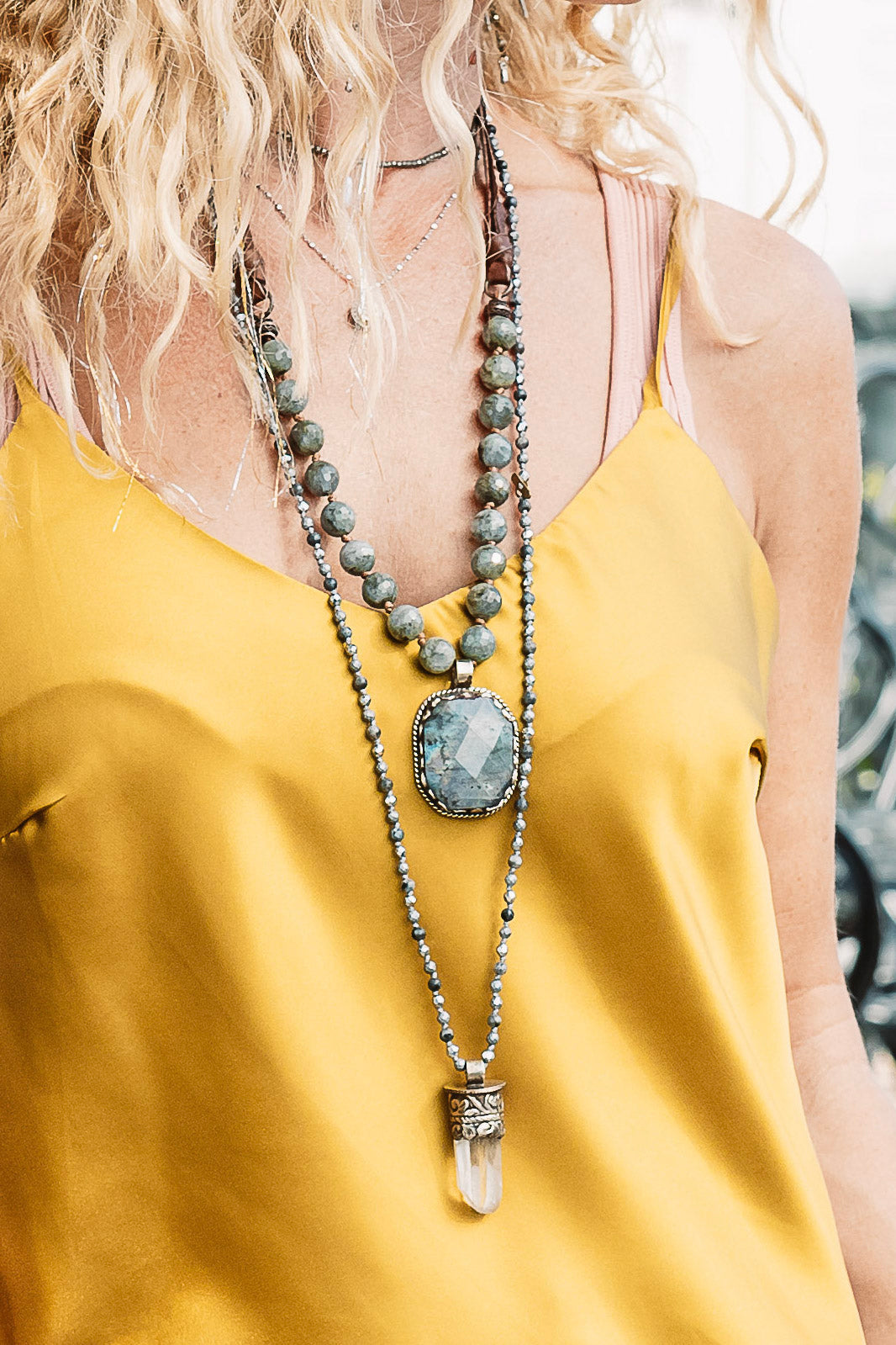 Our Knotty Gemstone Necklace in Quartz is the perfect accessory to add to any on-trend bohemian style outfit! Layered with any of our many statement necklaces, and paired with any of our earrings and bracelets, of your choosing, the Knotty Gemstone Necklace in Quartz will be sure to be a wonderful addition to any necklace layering style!