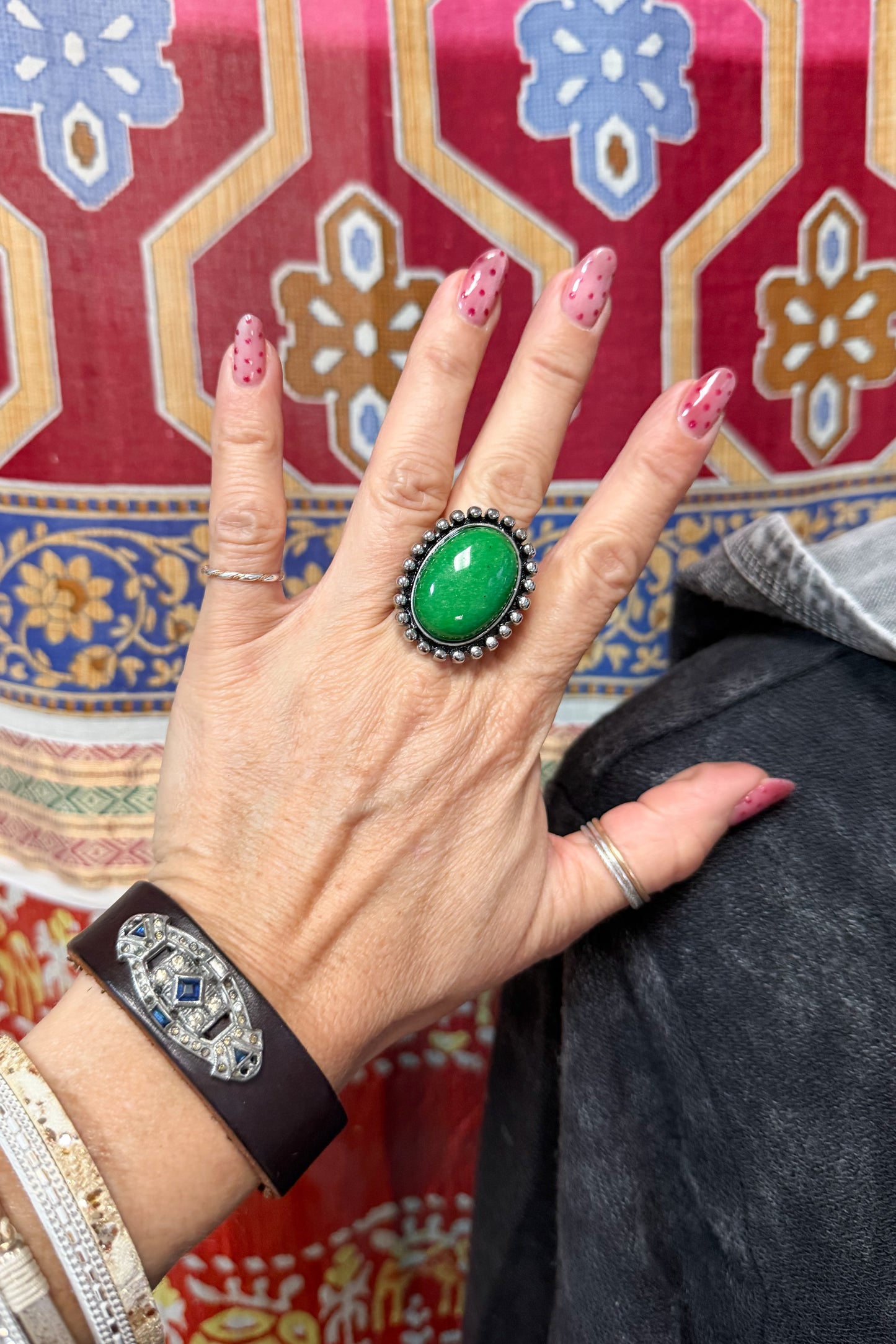 Our Stainless Green Jade Oval Ring is the perfect accessory to add to any on-trend bohemian style outfit! Paired with any of our many statement necklaces, earrings, and other bracelets, of your choosing, the Stainless Green Jade Oval Ring will be sure to be a wonderful addition to any outfit!