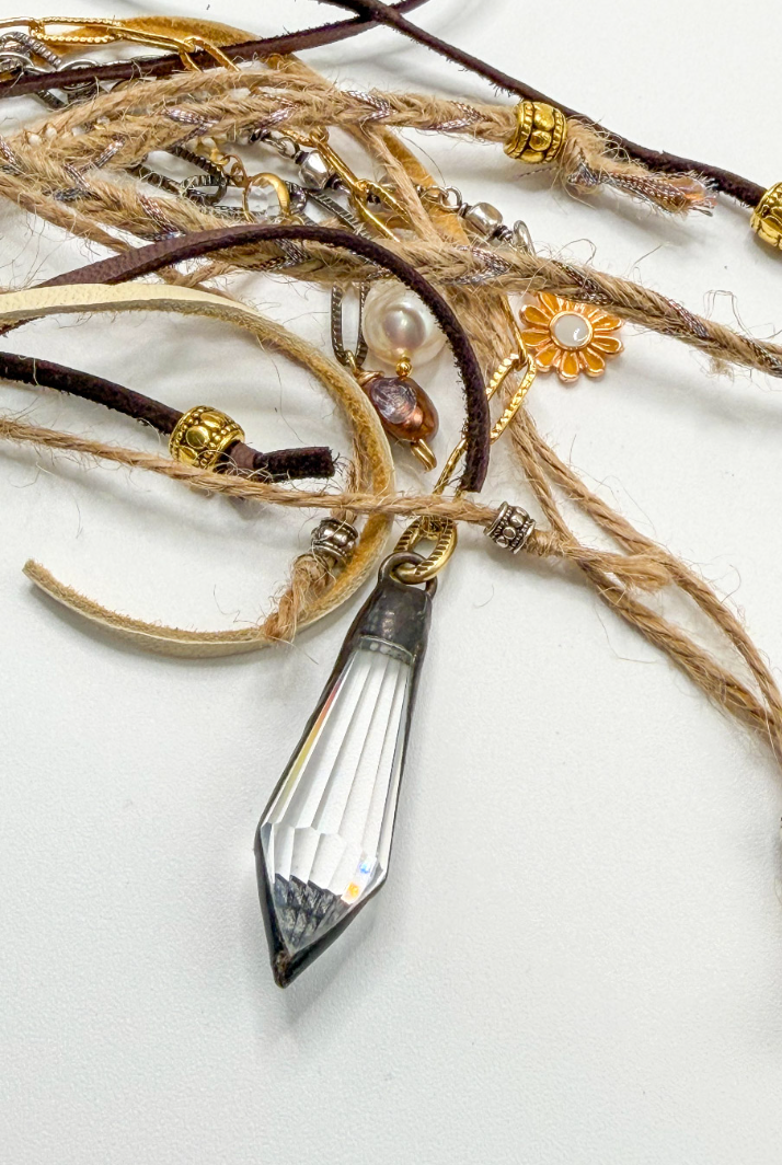 • A large chandelier charm with an assortment of leather, chain, and tie tassels.