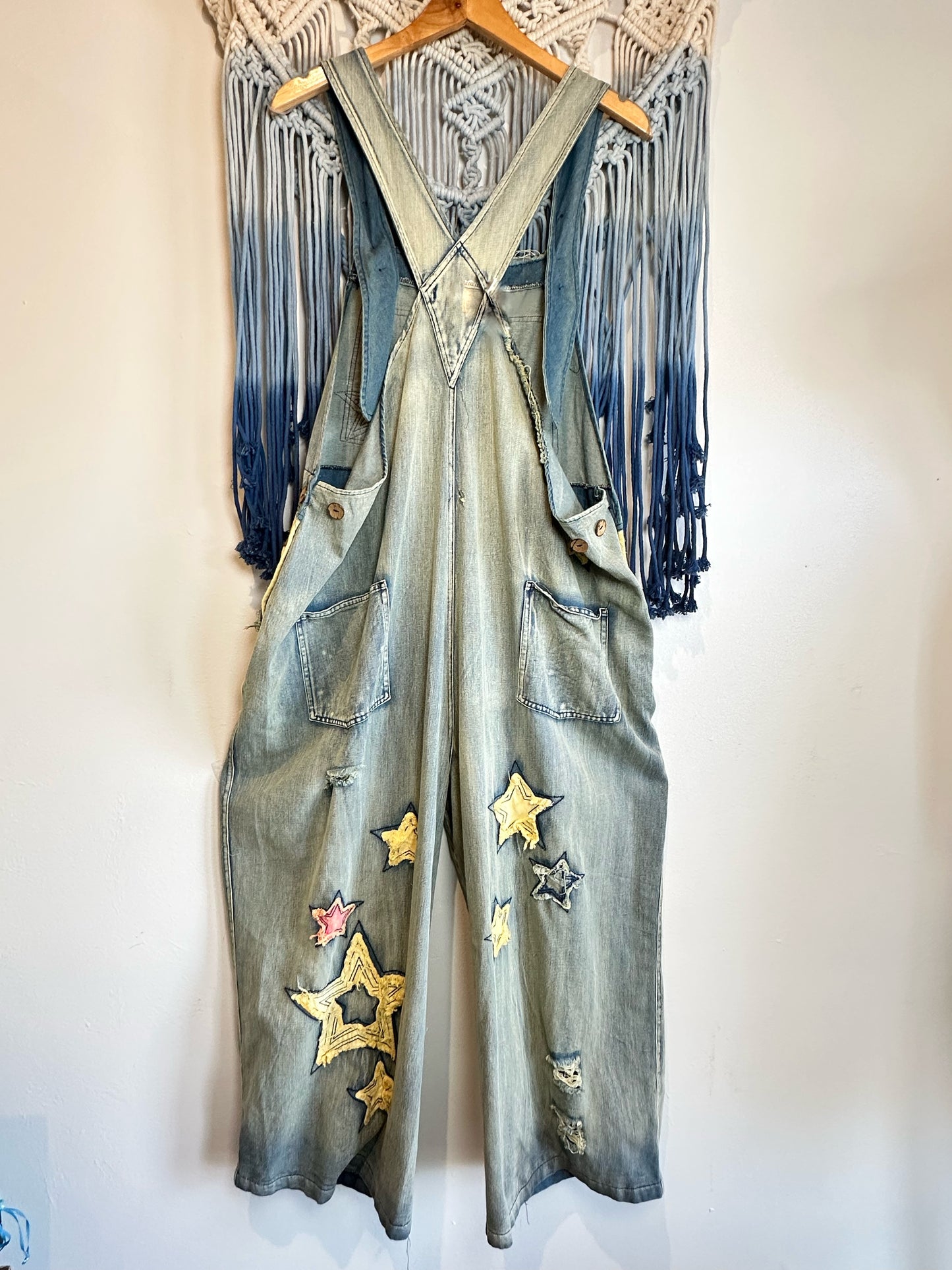 Patchwork Distressed Overalls in Light Denim