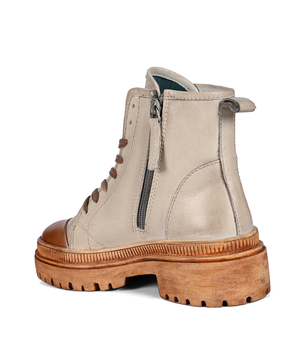 Kinship shows western charm meeting modern edge in this mid-height boot crafted for standout style and everyday ease. Featuring layered leather inlays, and rubber soles, this boot is full of personality from every angle. A convenient side zipper offers easy on and off, while the stacked leather heel provides comfort and stability. Finished with a round toe, leather lining, and hand-burnished detailing, this boot delivers bold attitude and undeniable flair in every step