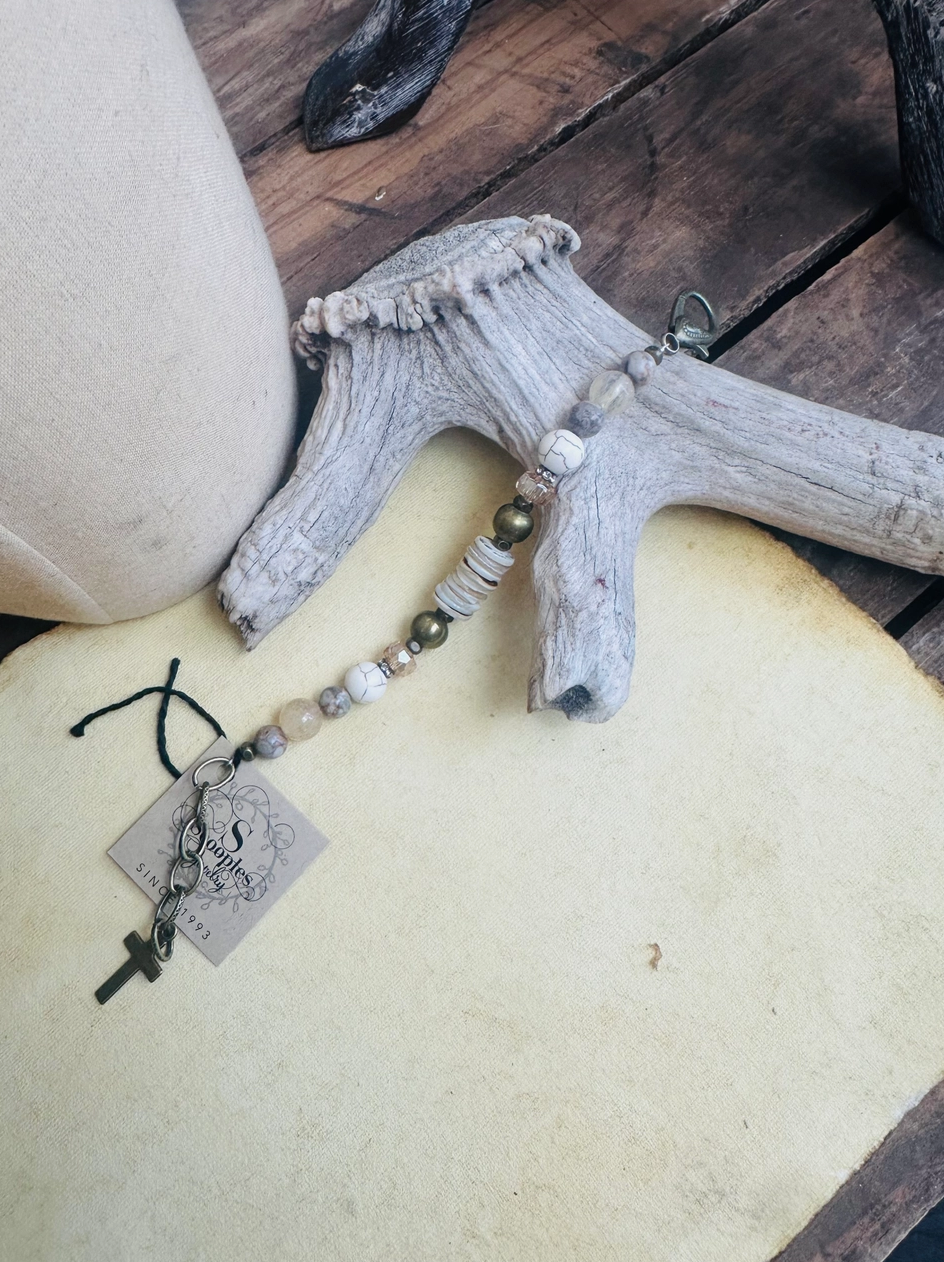• Made of Howlite, Crazy Jasper Agate Beads, Seaglass Beads, Sliced shell beads, bronze metal beads and charms and trinkets.