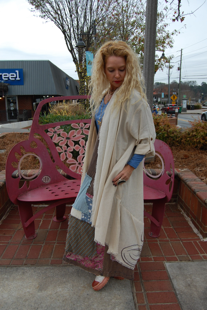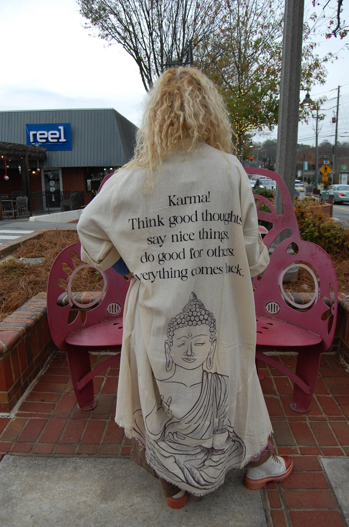 This Buddha Print Duster in Cream is the perfect stylish statement piece to add to your closet, and or any on-trend bohemian style outfit!This duster, adorned with the serene image of Buddha, invites peace into every step. The gentle folds of fabric mirror the quiet flow of breath, while the print reminds us to carry mindfulness in movement, and compassion in style. It's a meditation in motion.