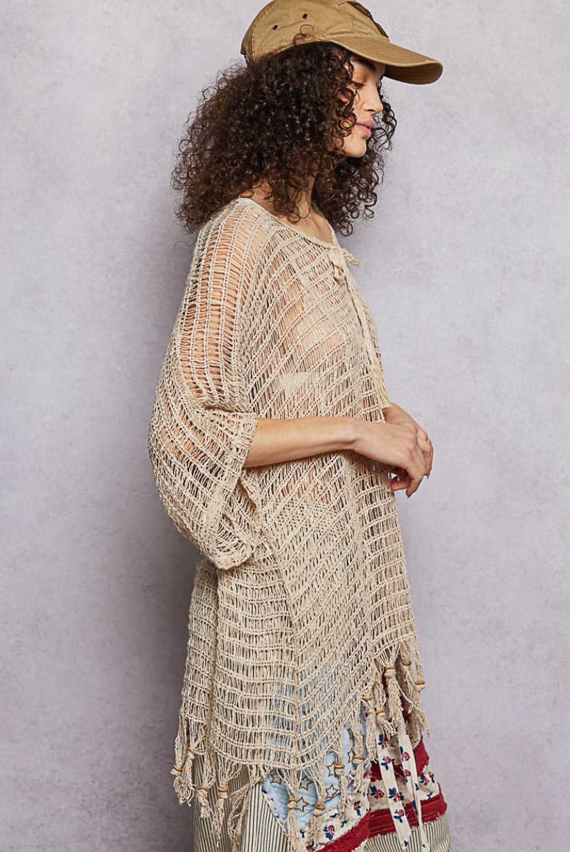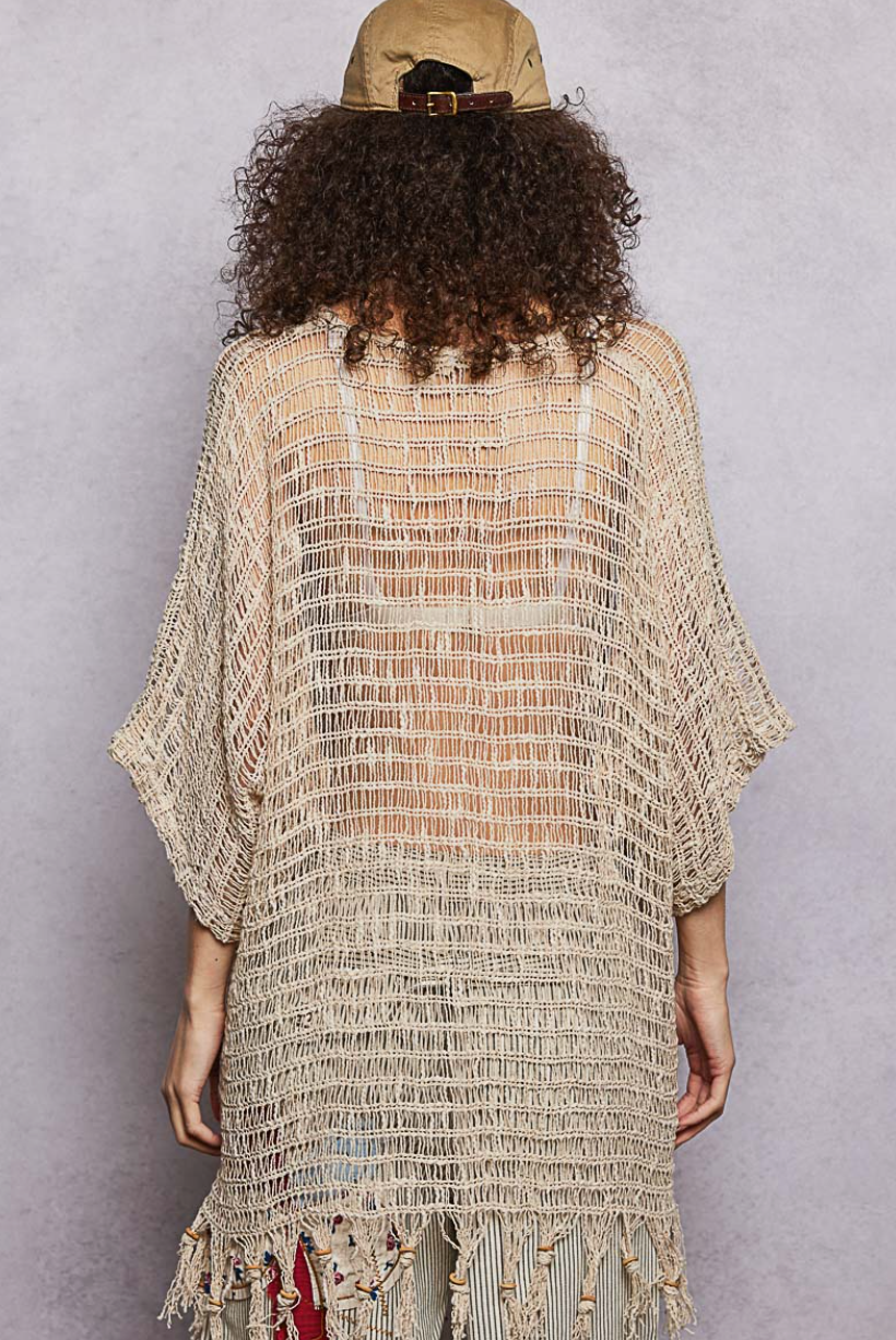 Bohemian Crochet Open Knit Tassel Fringe Poncho Top in Natural