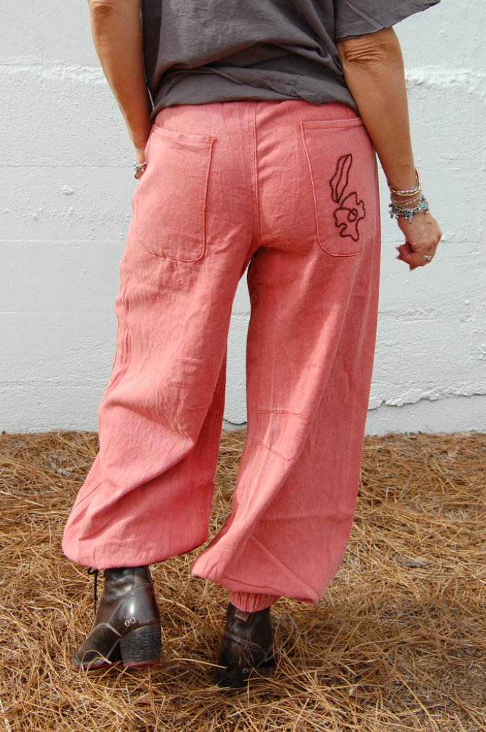 To maintain quality, these Floral Embroidered Pants in Dried Apple are best when hand or machine washed with cold water, with like colors, and hung or laid out to dry!