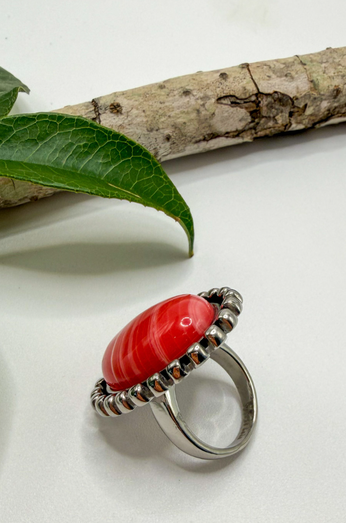 Stainless Red Coral Oval Ring
