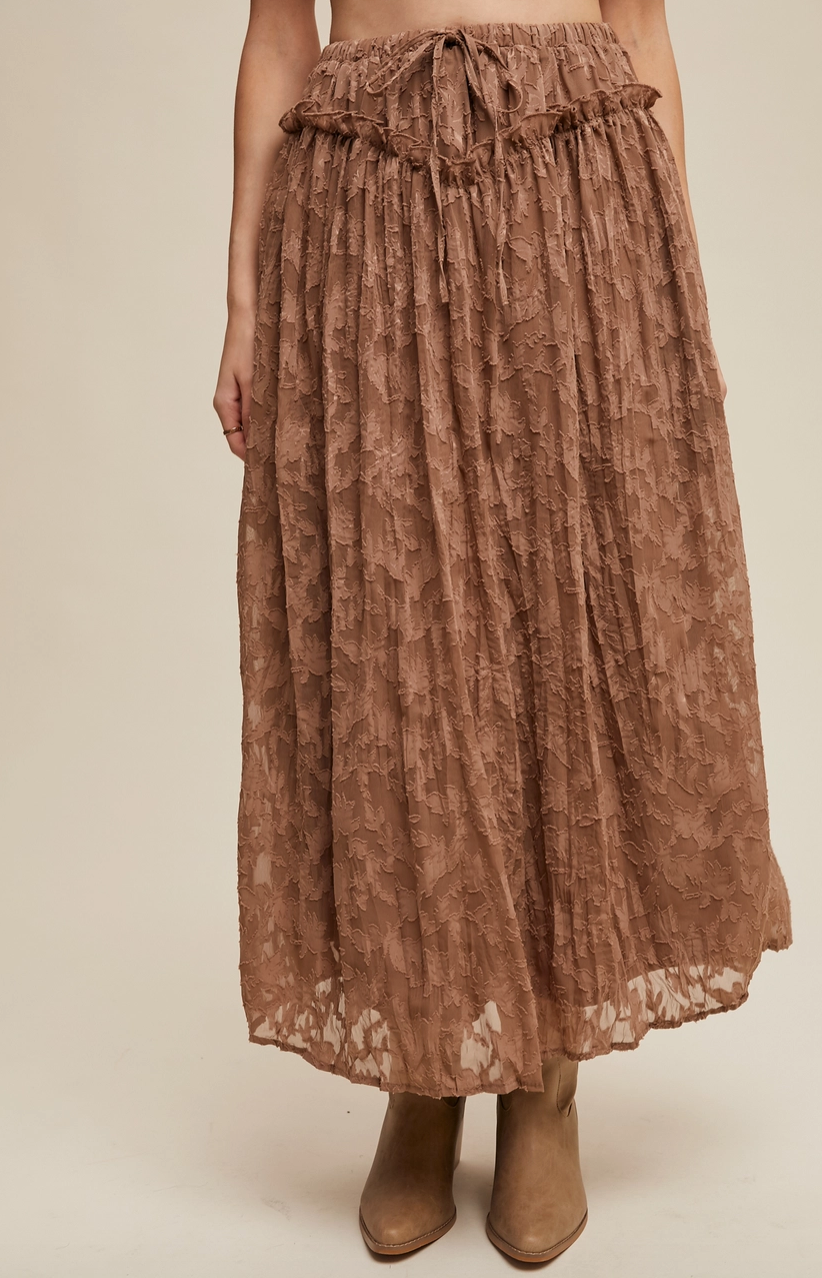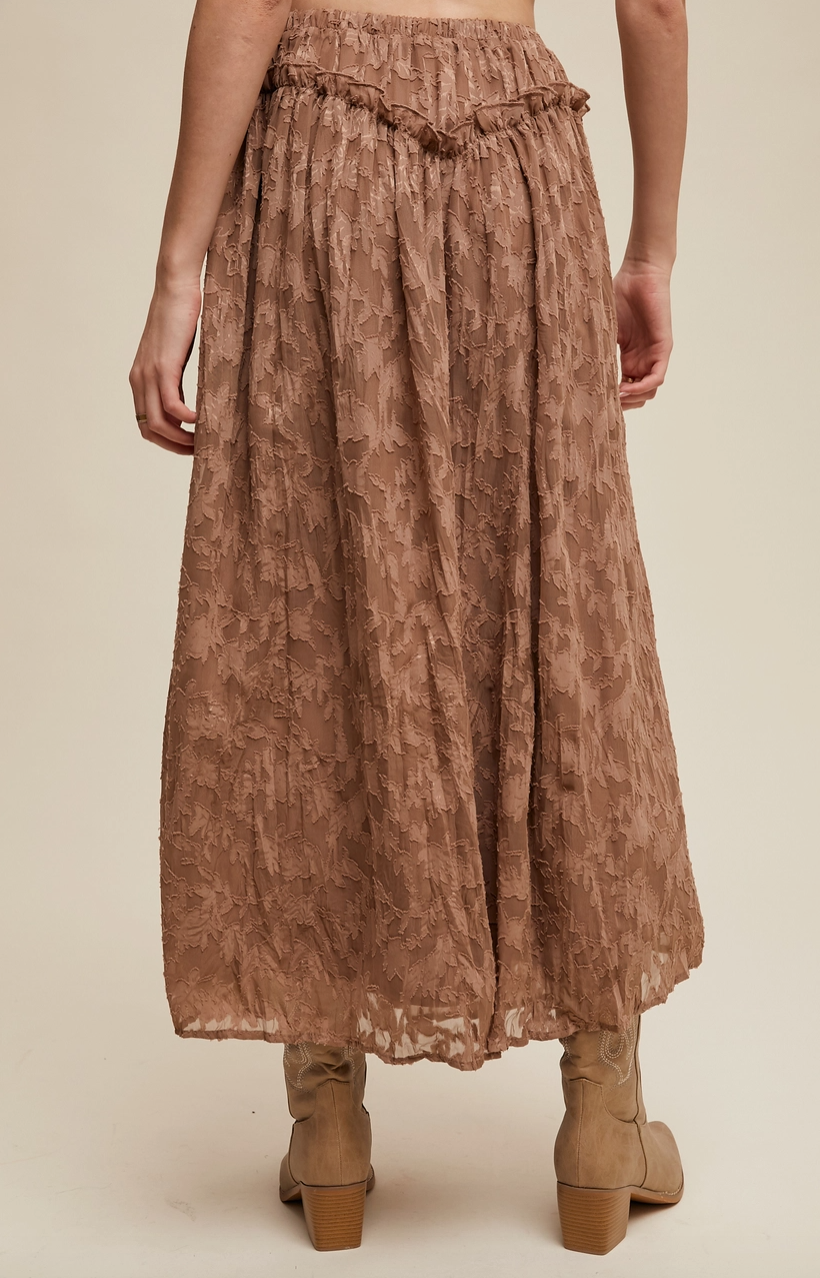 Our Farrah Floral Textured Skirt in Brown is the perfect stylish bottom to add to your closet, and or any on-trend bohemian style outfit! Have your moment in this stunning maxi skirt, featuring flowy fabric. This beautiful & trendy is the perfect statement staple for your closet!