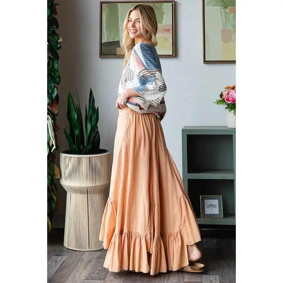 These Washed Wide Leg Ruffled Hem Pants In LT Coral are the perfect stylish bottoms to add to your closet, and or any on-trend bohemian style outfit! Accompany a mineral wash detail and flowy material. These pants give any look a stylish touch!