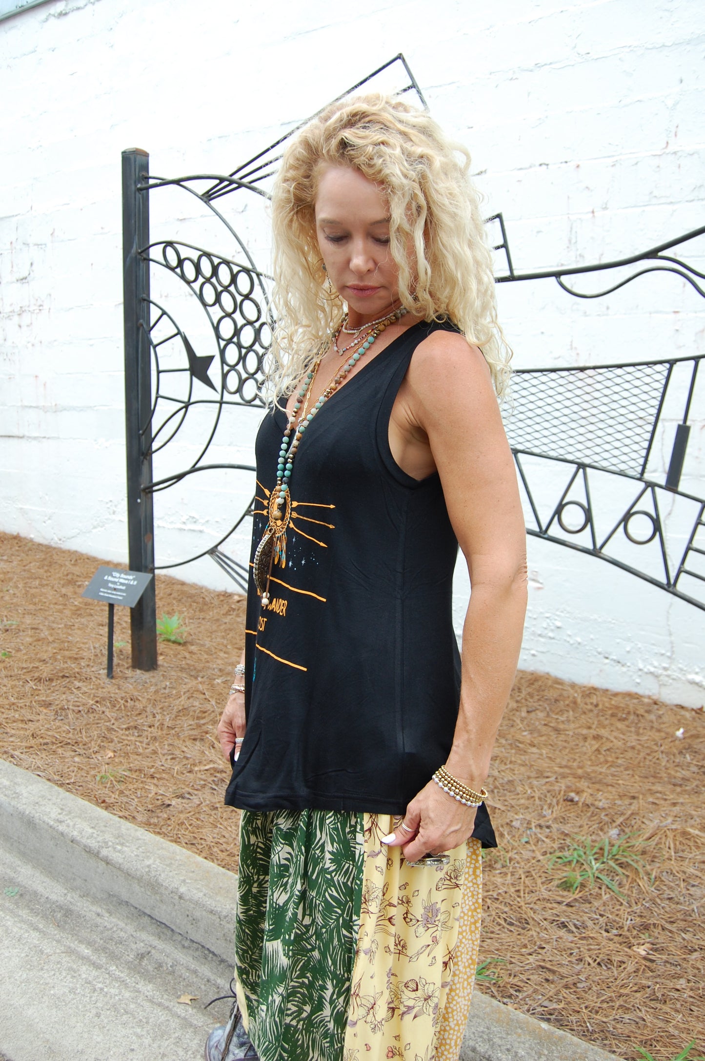 • This Dreamcatcher Graphic Tank Top in Black is the perfect stylish basic to add to your closet, and or any on-trend bohemian style outfit! Giving you a light breathable fit, with a trendy dreamcatcher graphic print, you can pair this tank under any kimono, cardigan, jacket, dress, or low-cut top! It's designed for durability, providing an ideal combination of comfort, stretch, and breathability.