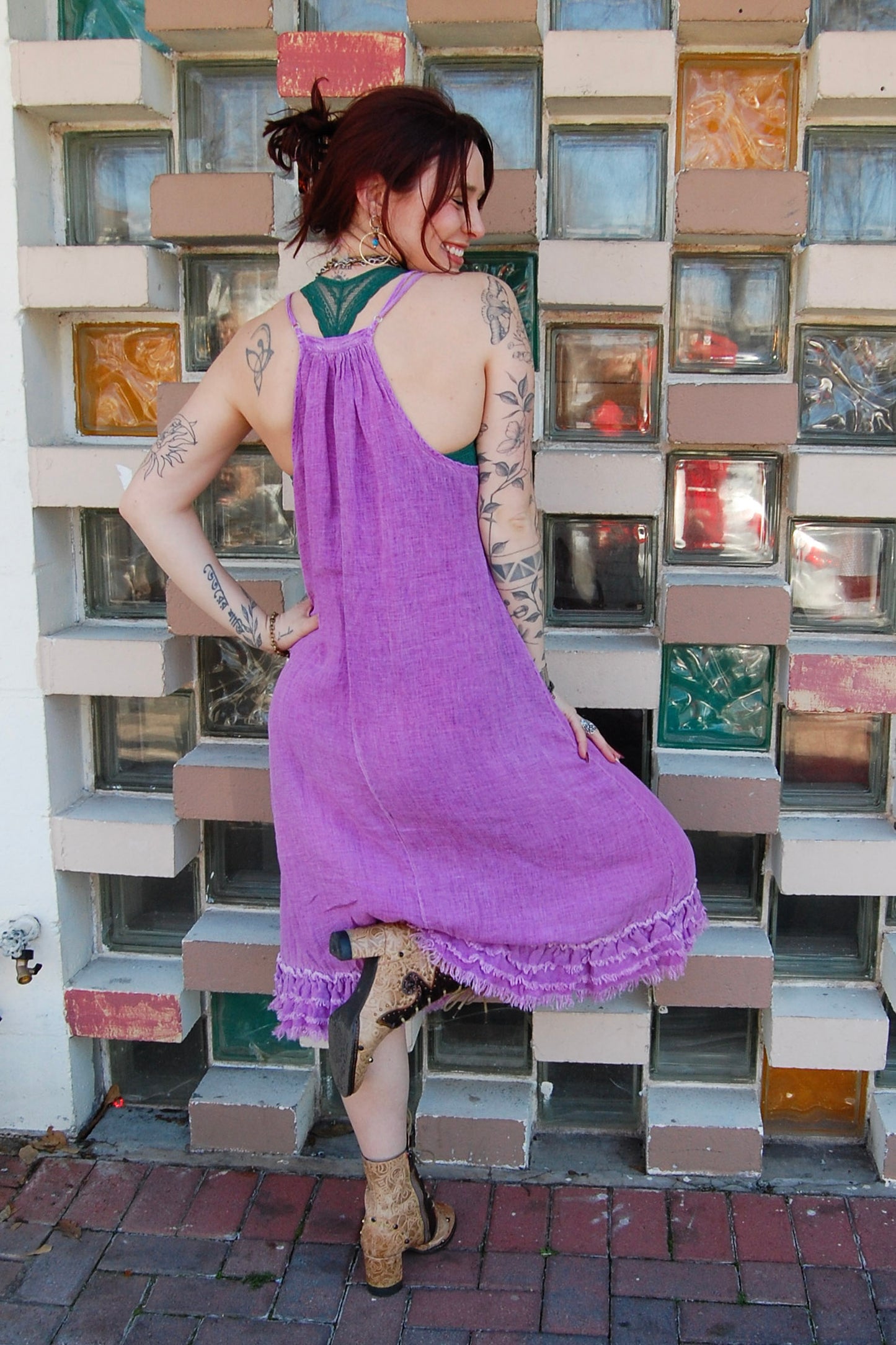 This Frannie Fringe Dress in Magenta contents contain 100% Lino material. Total body length (shoulder to bottom) measures 46 inches.