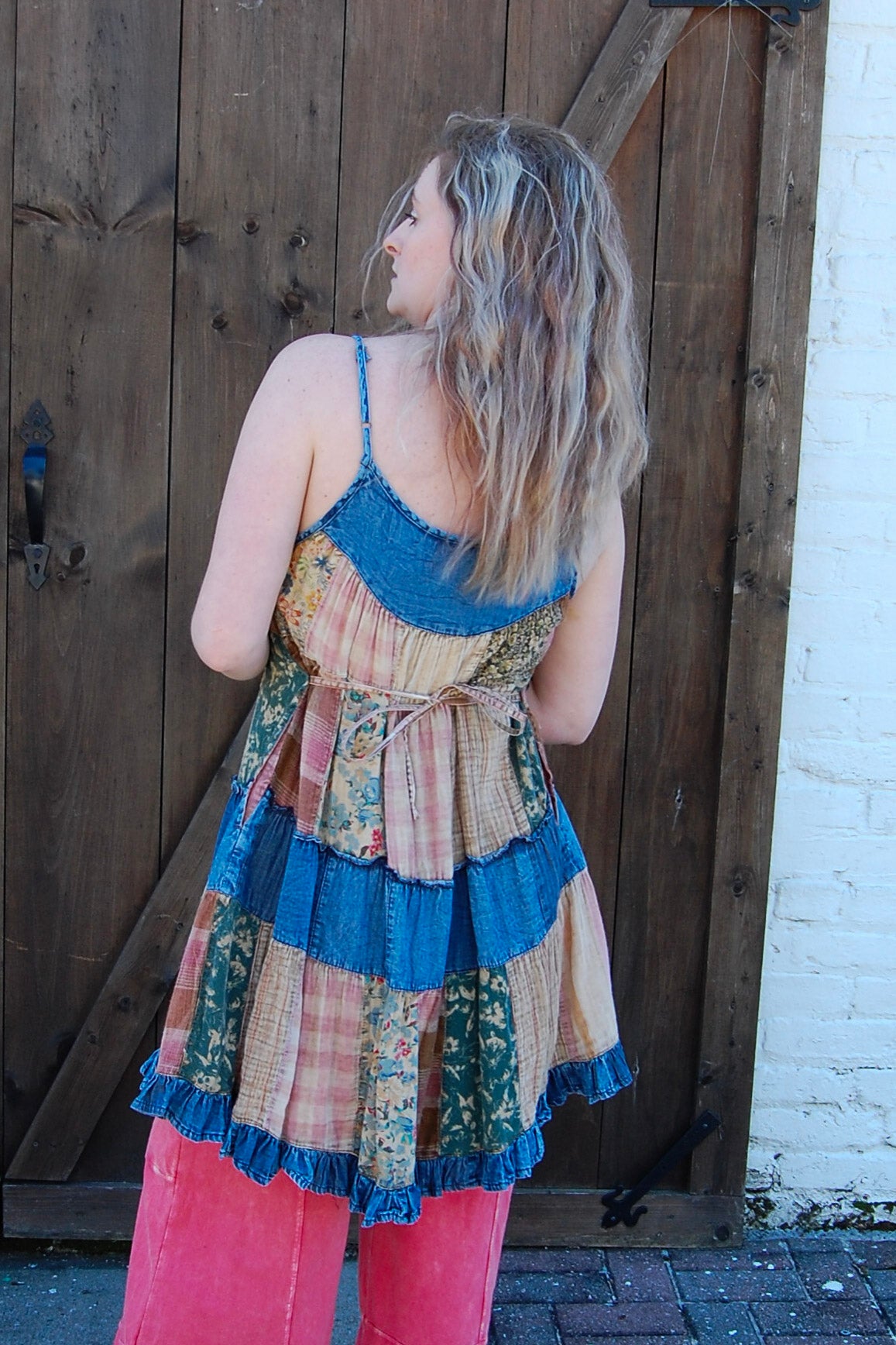 The ultra flattering Patchwork Babydoll Dress in Demin will be your favorite wardrobe staple! The dress features a straight neckline, adjustable straps, and ruffles on the bottom for added detail. Paired with flats or heels, it's an elegant option for day or evening. The Patchwork Babydoll Dress in Demin is lined.