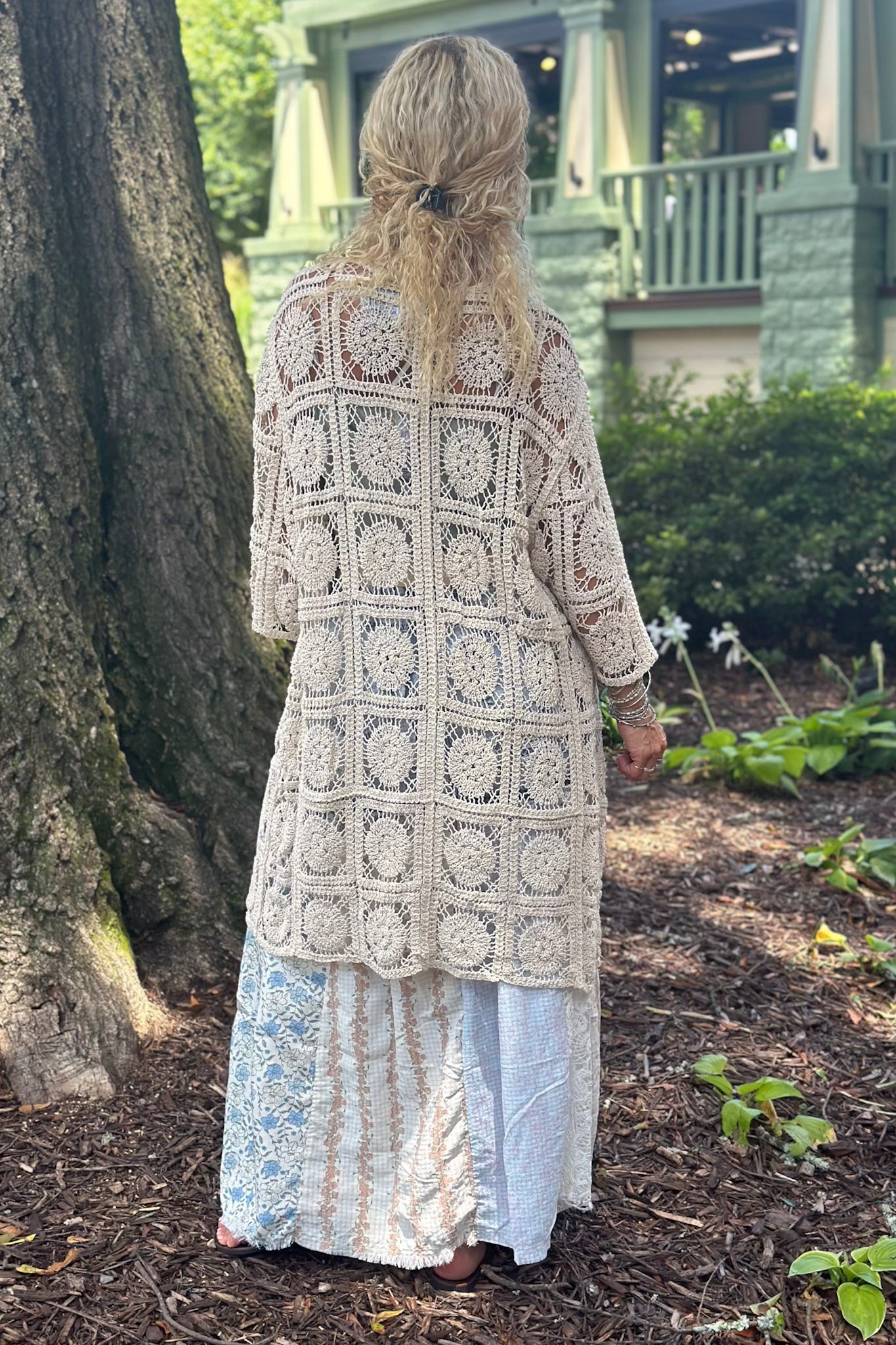 To maintain quality, this Crochet Block Cardigan in Beige is best when washed in cold water and hung dry. Low ironing if needed!