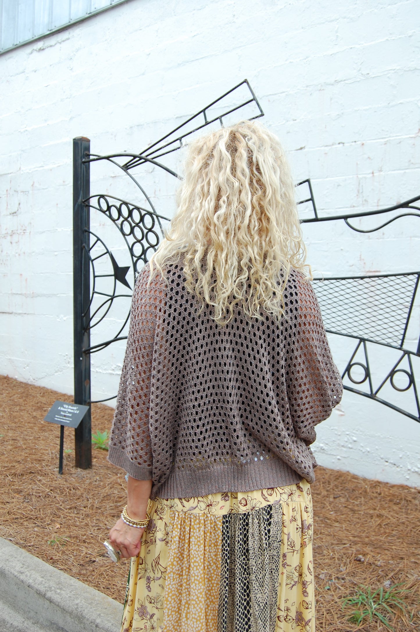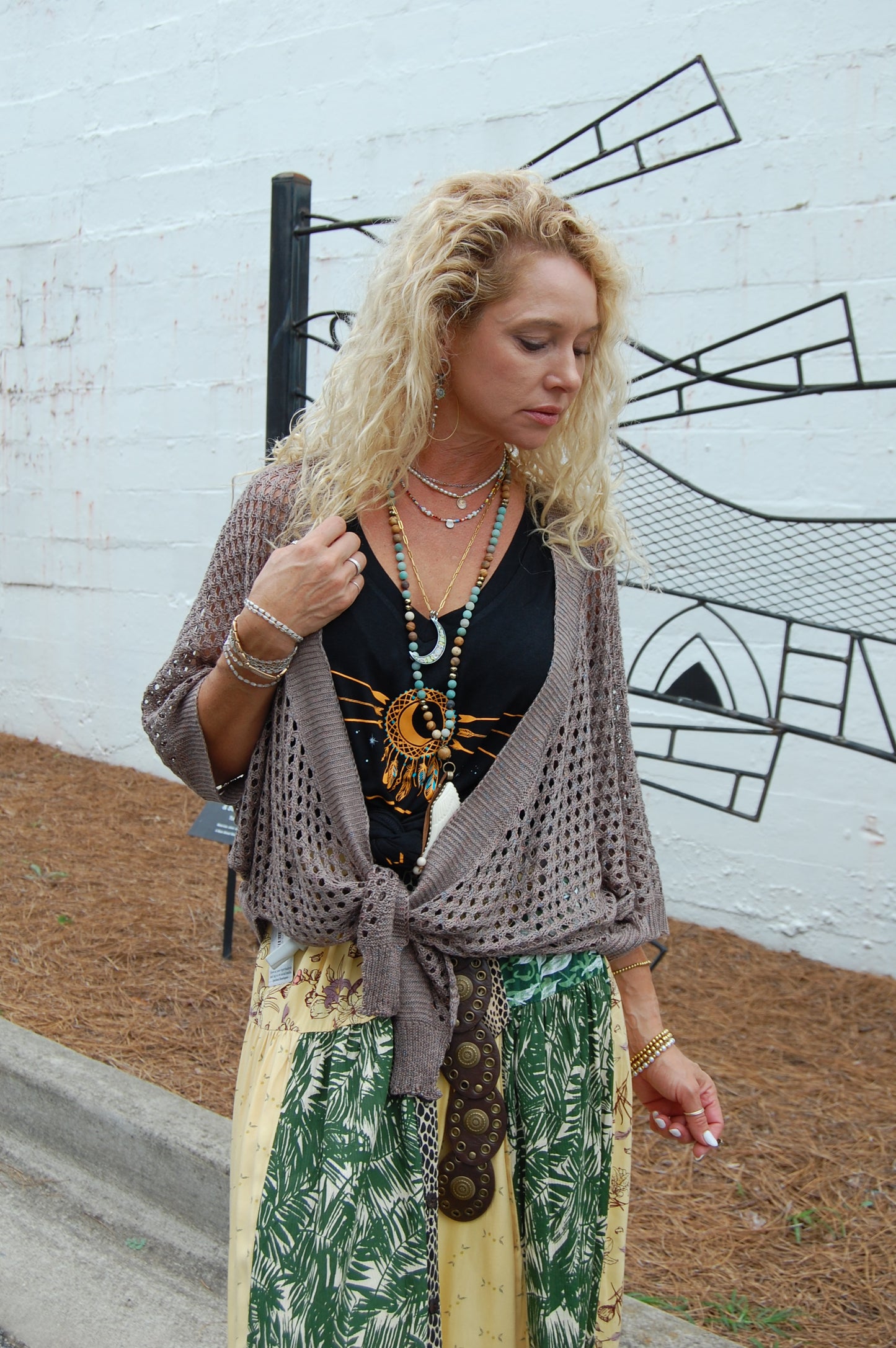 Throw on this Mandy Metallic Cardigan in Mocha. This gorgeous knitted cardigan features a tie in the front. Perfect for any season, this relaxed-fit piece drapes beautifully over your favorite outfits.