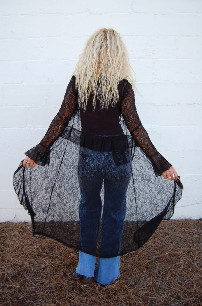 To maintain quality, this Lana Lace Ruffle Duster in Black is best when washed in cold water and hung dry. Low ironing if needed!