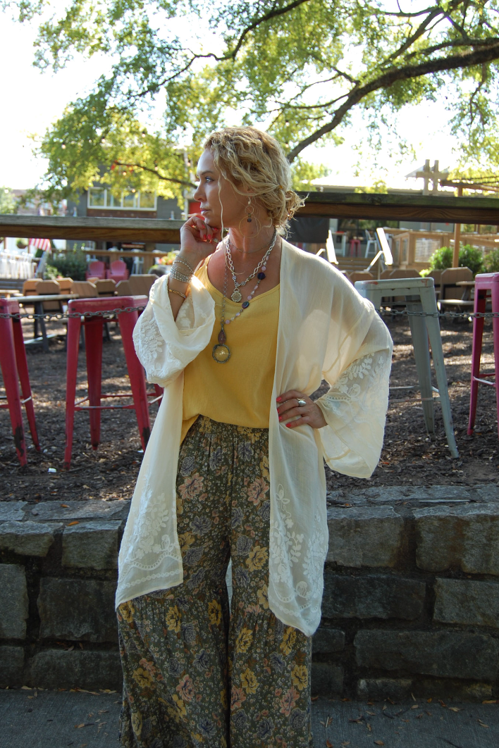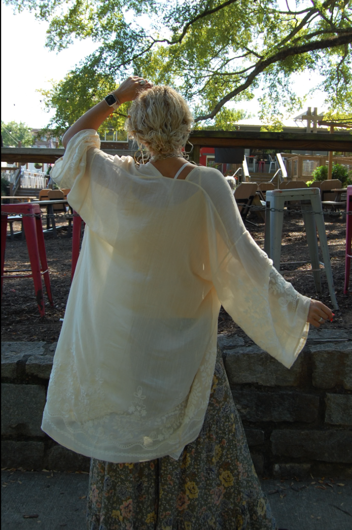 Throw on this Fiona Floral Vine Kimono in Cream. This kimono is light weight and airy and you can dress it up or down. Perfect for any season, this relaxed-fit piece drapes beautifully over your favorite outfits.