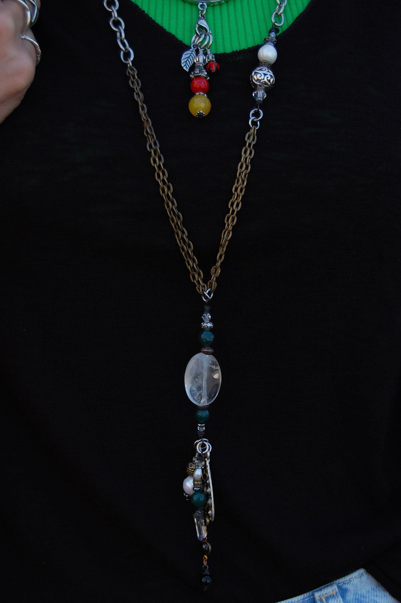 • A 3 inch drop featuring a 1 inch focal gemstone pendant,