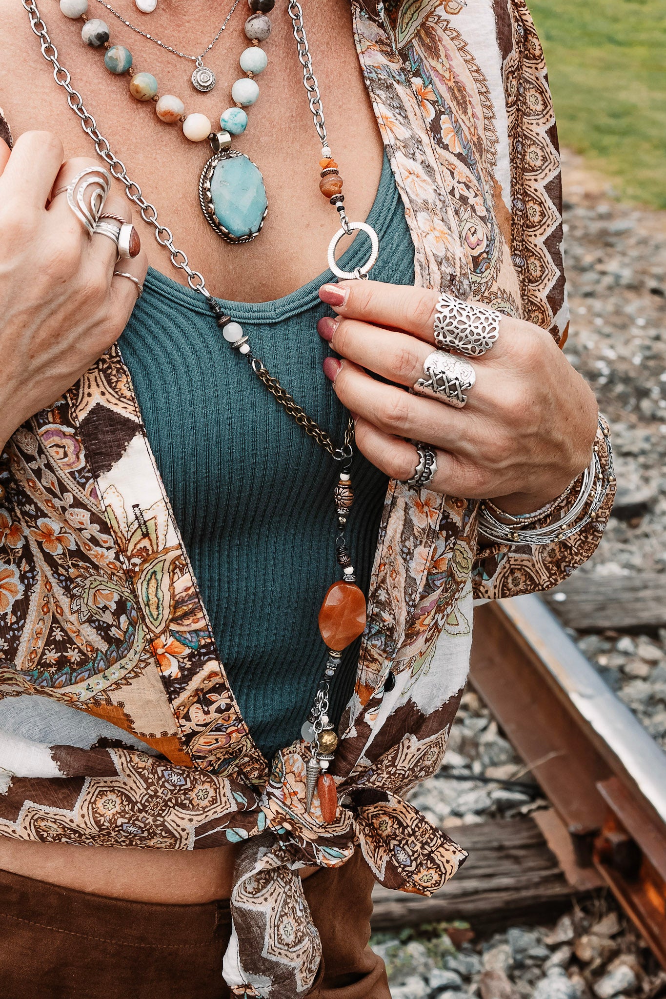 • A 3 inch drop featuring a 1 inch focal gemstone pendant,