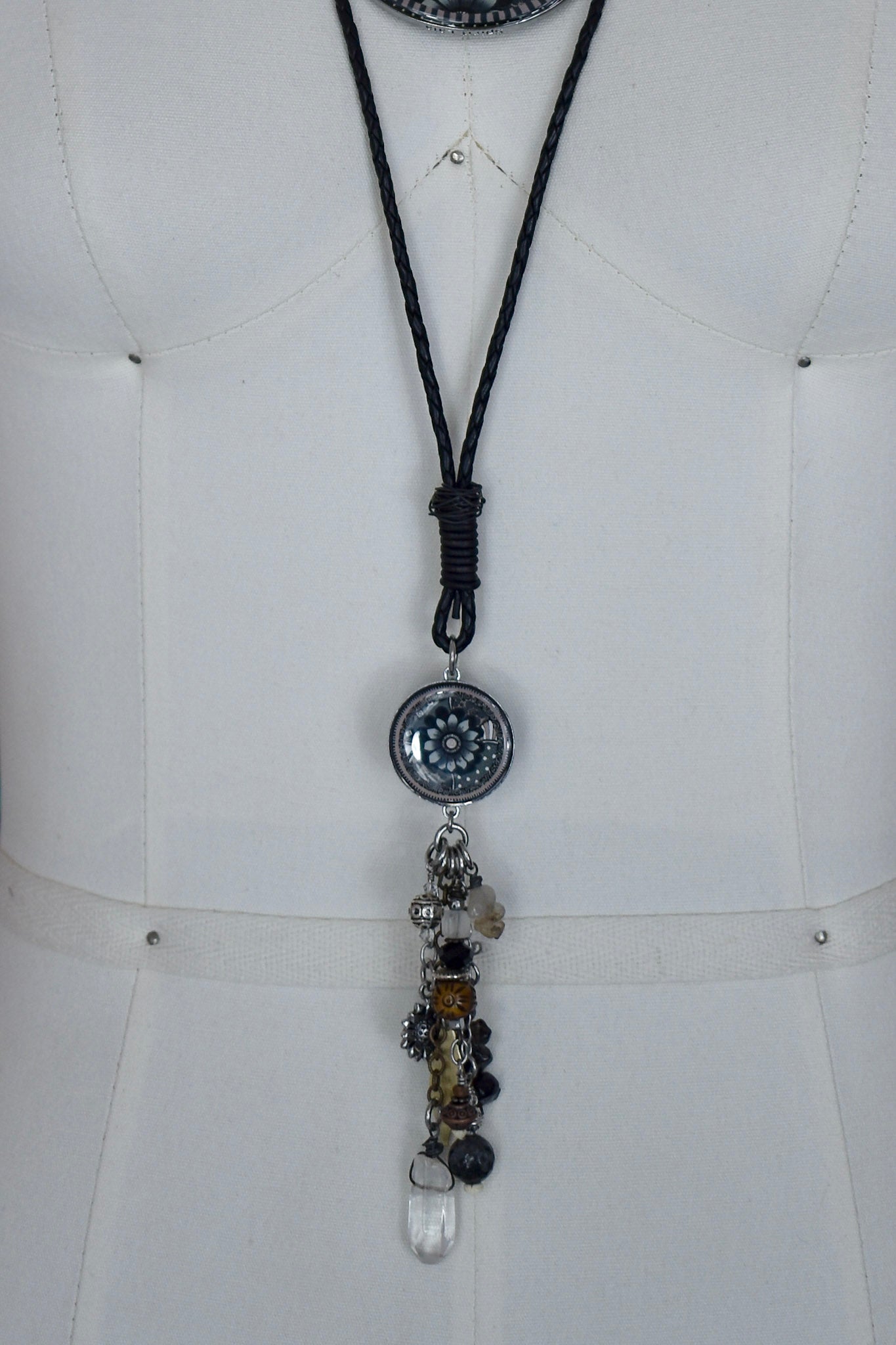 Spirit Lala: Grey & Black Flower Leather Drop Necklace