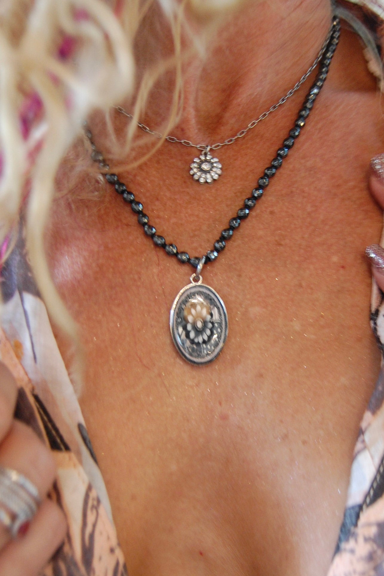 Spirit Lala: Grey Black Flower Beaded Oval Necklace