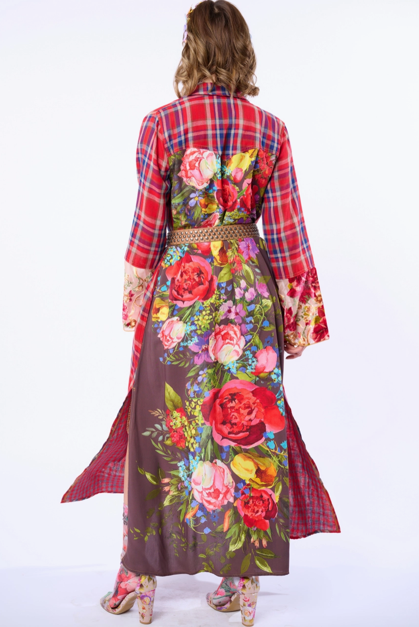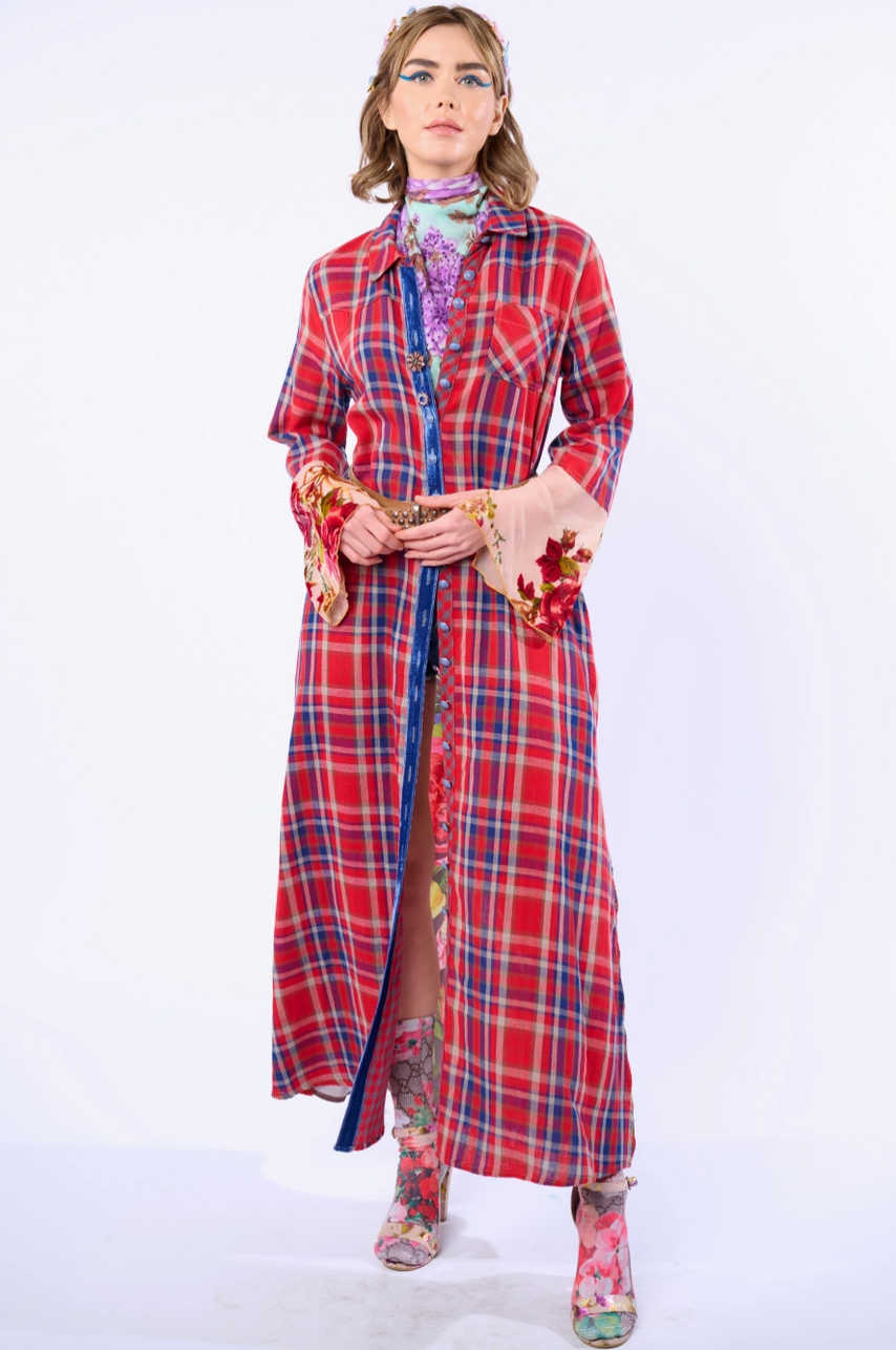 This Anna Button Up Duster in Red Plaid Combo contains 100% Cotton material.