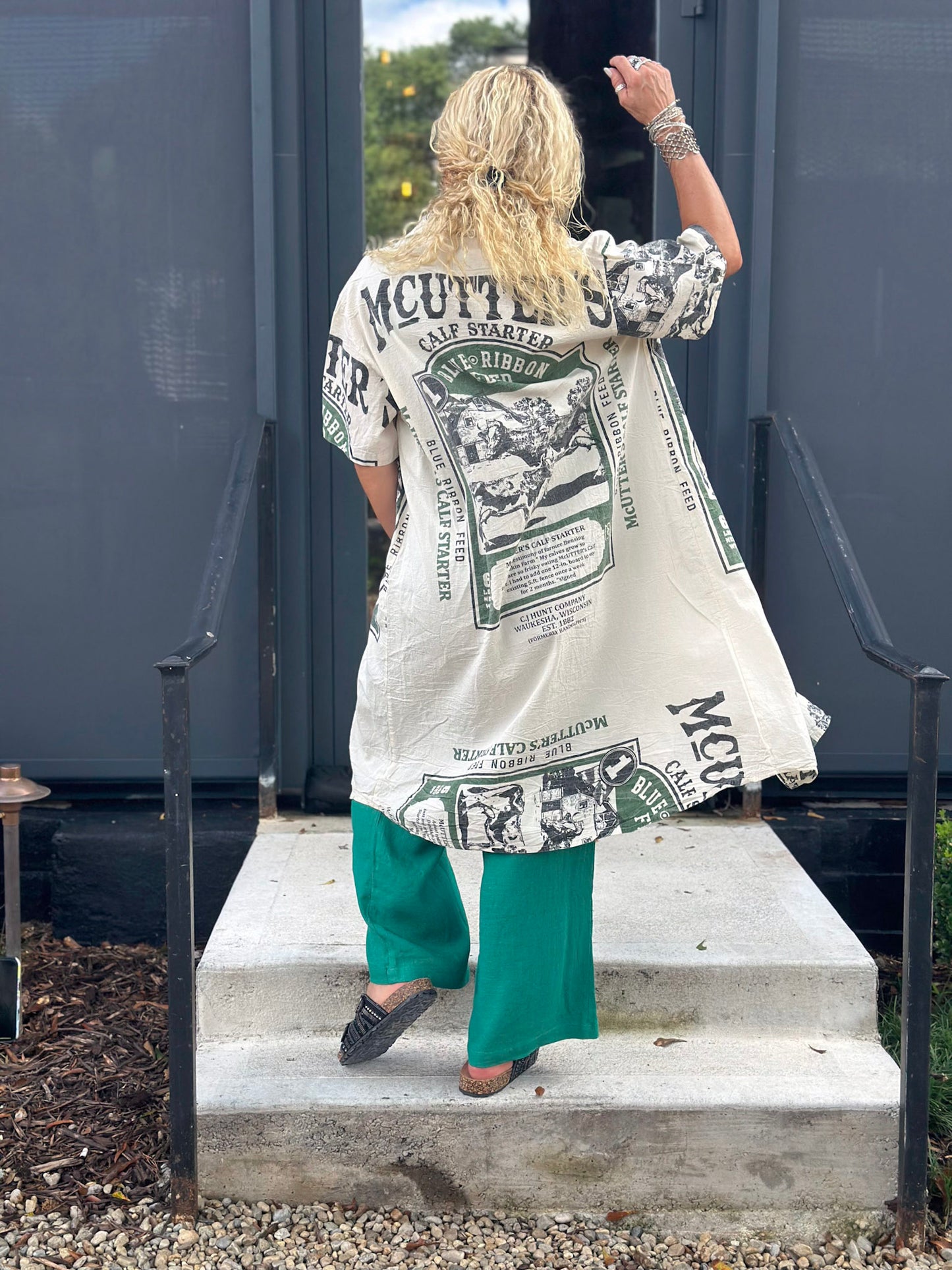 This Vintage T-Shirt Dress in McCutter's Cow contents contain 100% Cotton material. Total body length (shoulder to bottom) measures 34 inches.