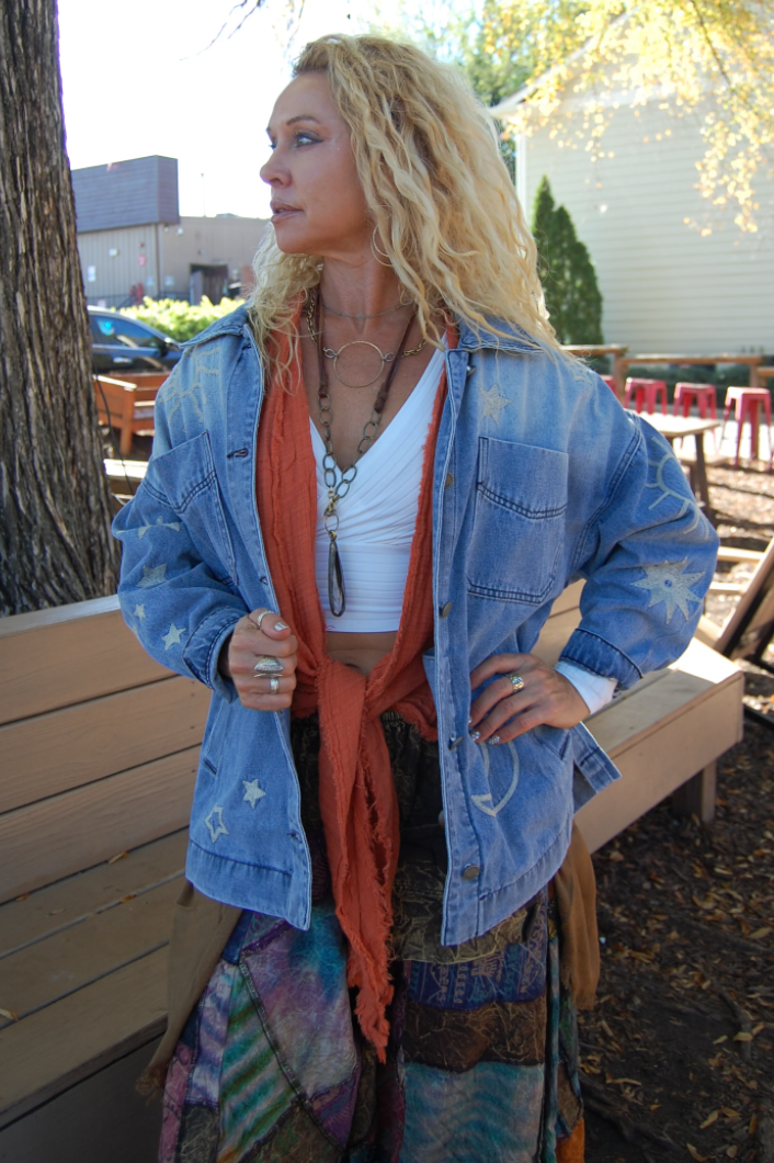 Throw on this Embroidered Denim Jacket in Medium Wash for an effortlessly chic layer. The long sleeves and open front give a relaxed stylish vibe. It is super versatile and can be either dressed up or down. This also includes a beautiful distressed and embroidered design. Perfect for any season, this relaxed-fit piece drapes beautifully over your favorite outfits.