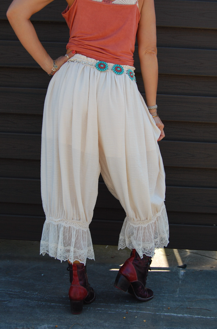 These charming cropped bloomer pants feature an elastic waist and intricate lace trim at the cuffs. The soft, breathable fabric blend offers comfort and style for a variety of casual occasions.