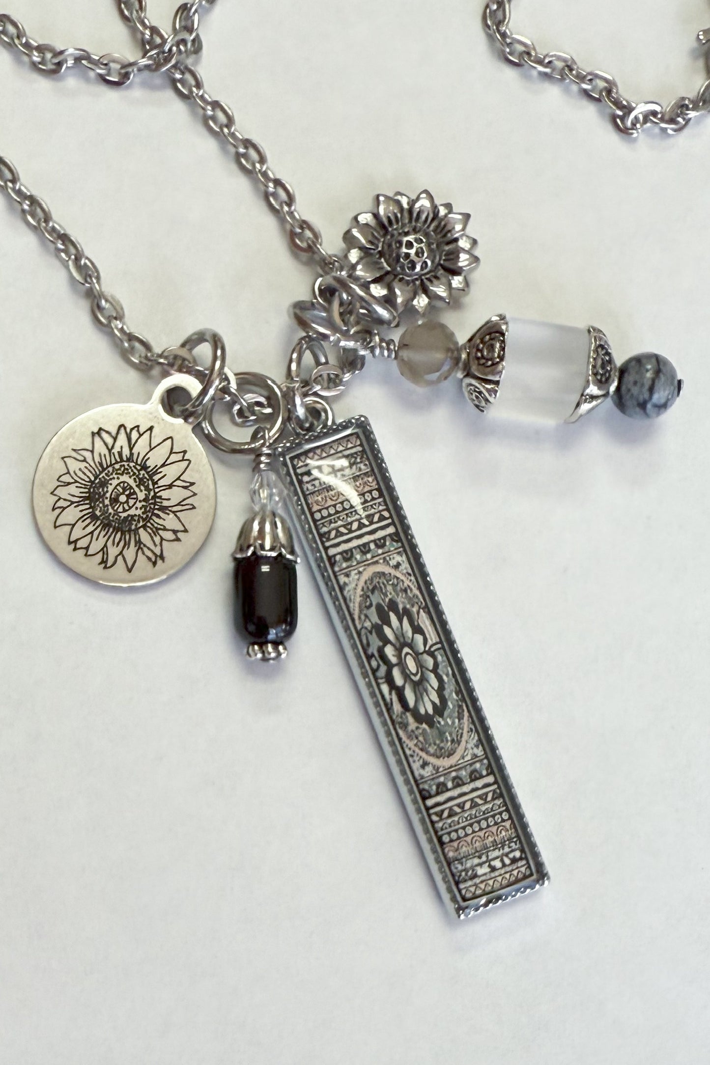 • An assortment of 1/2 inch, in size, stainless flower charms, a 1 inch color coordinated gemstone beaded charm, and a 1/2 inch gemstone beaded charm.