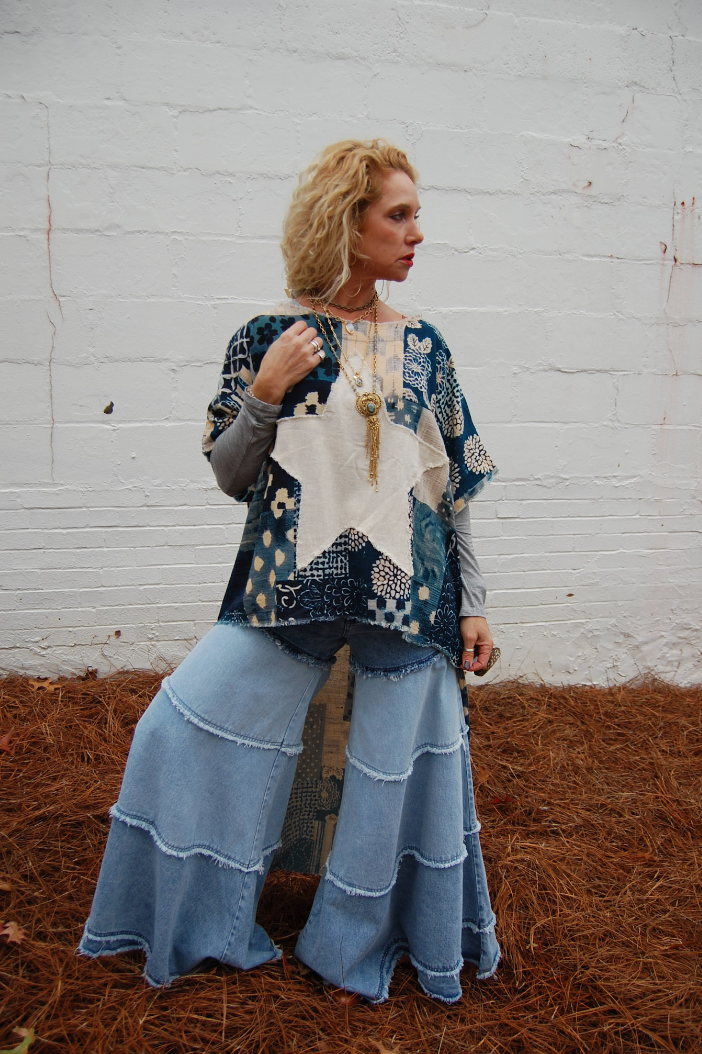 Throw on this Hi-Lo Print & Star Tunic in Navy.Made in rich blue tones, this hi-lo tunic features a relaxed, flowing fit that flatters and moves with ease. The standout detail? A handcrafted-style patchwork star on the front—adding just the right touch of rustic Americana and personality. Perfect with leggings, jeans, or layered over a long skirt, this tunic brings easy style and a hint of vintage soul to your everyday wardrobe.