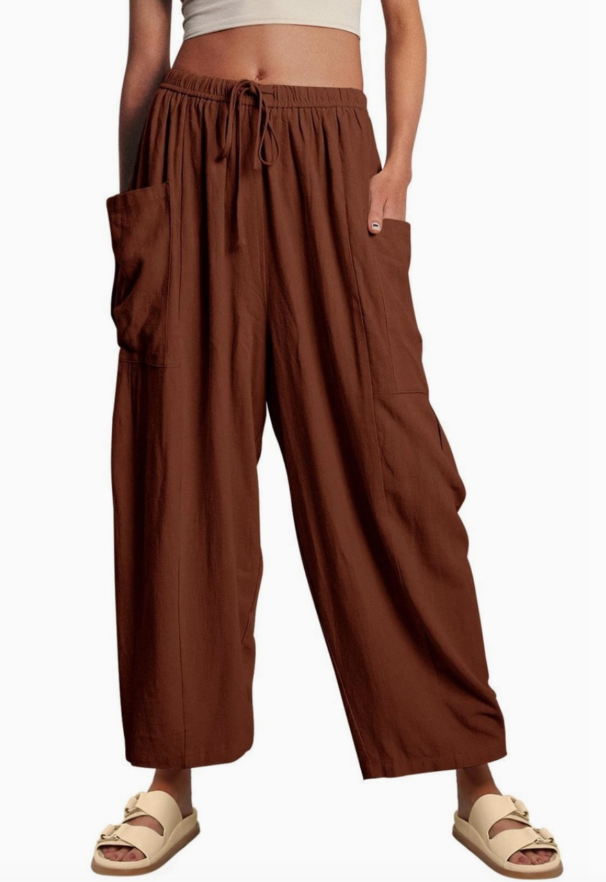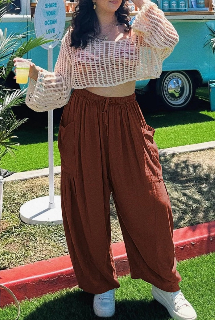 Artemis Pants in Coffee are the perfect stylish bottoms to add to your closet, and or any on-trend bohemian style outfit! Accompanying a high waist and flowy fabric. These pants give any look a stylish touch!