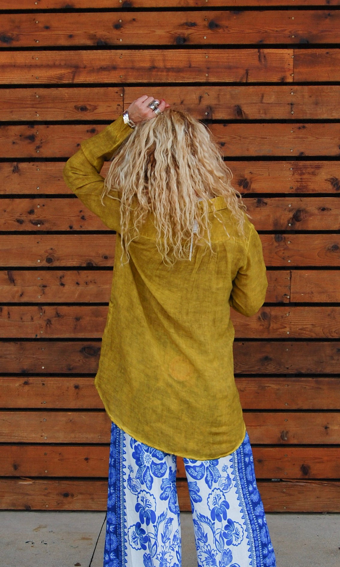To maintain quality, this Anoushka Linen Top in Mustard is best when washed in cold water with like colors and hung dry. Low ironing if needed!