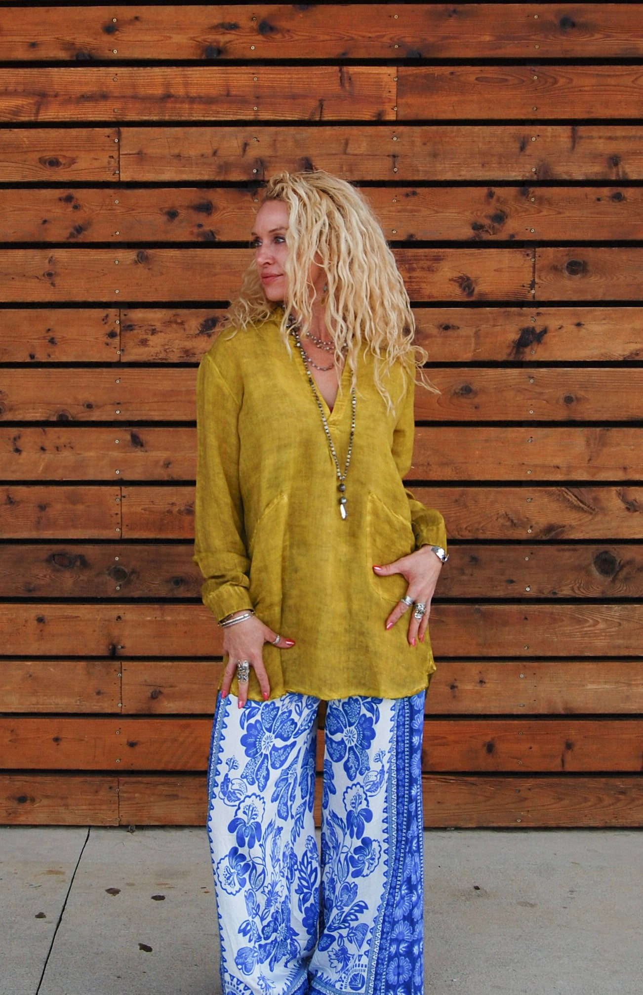 This Anoushka Linen Top in Mustard is the perfect stylish outing top to style with any outfit. A staple item with bright colors to make any outfit pop, and it features convenient side pockets for any of your everyday items. You can pair this top under any kimono, cardigan, or jacket.