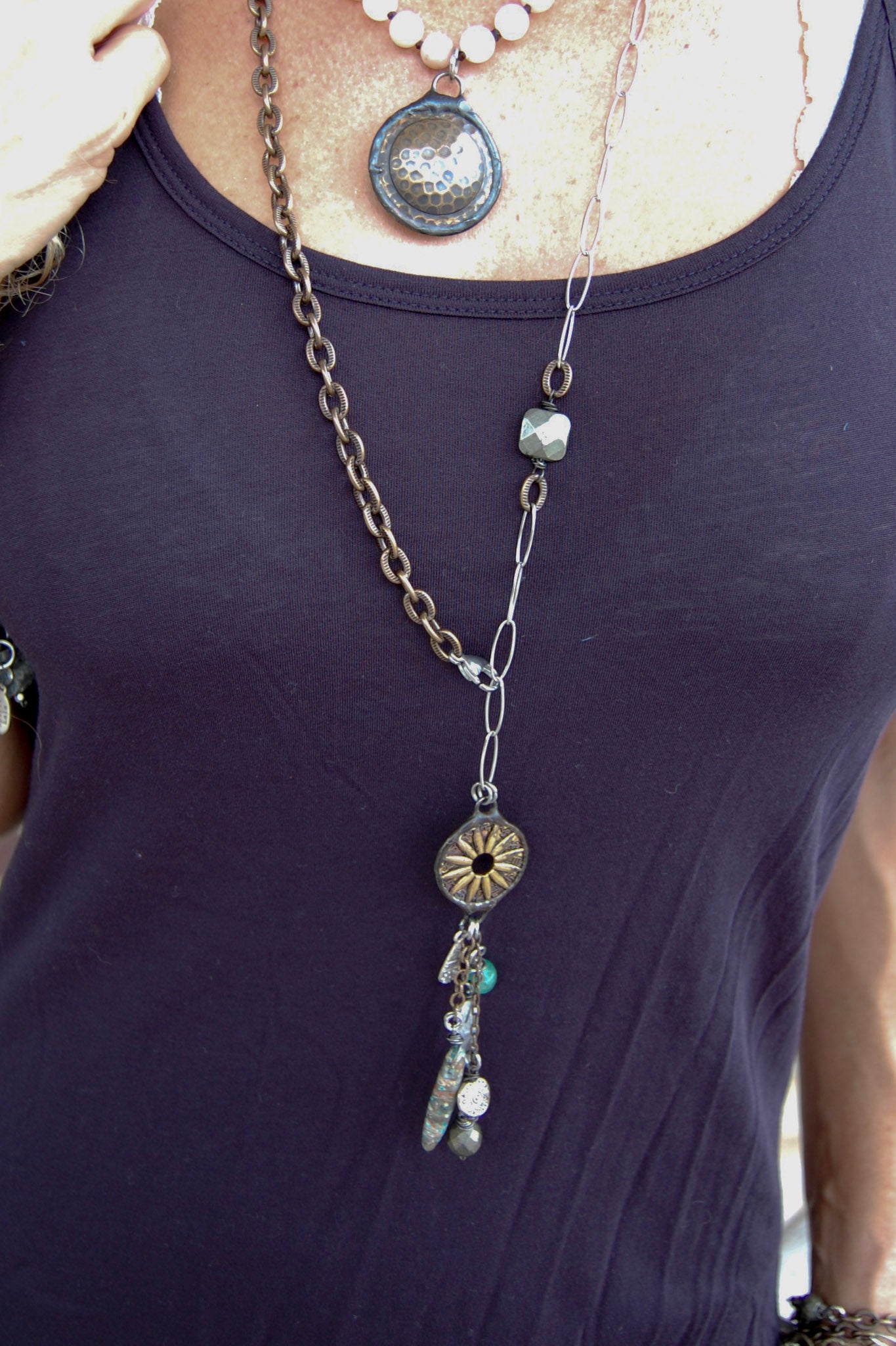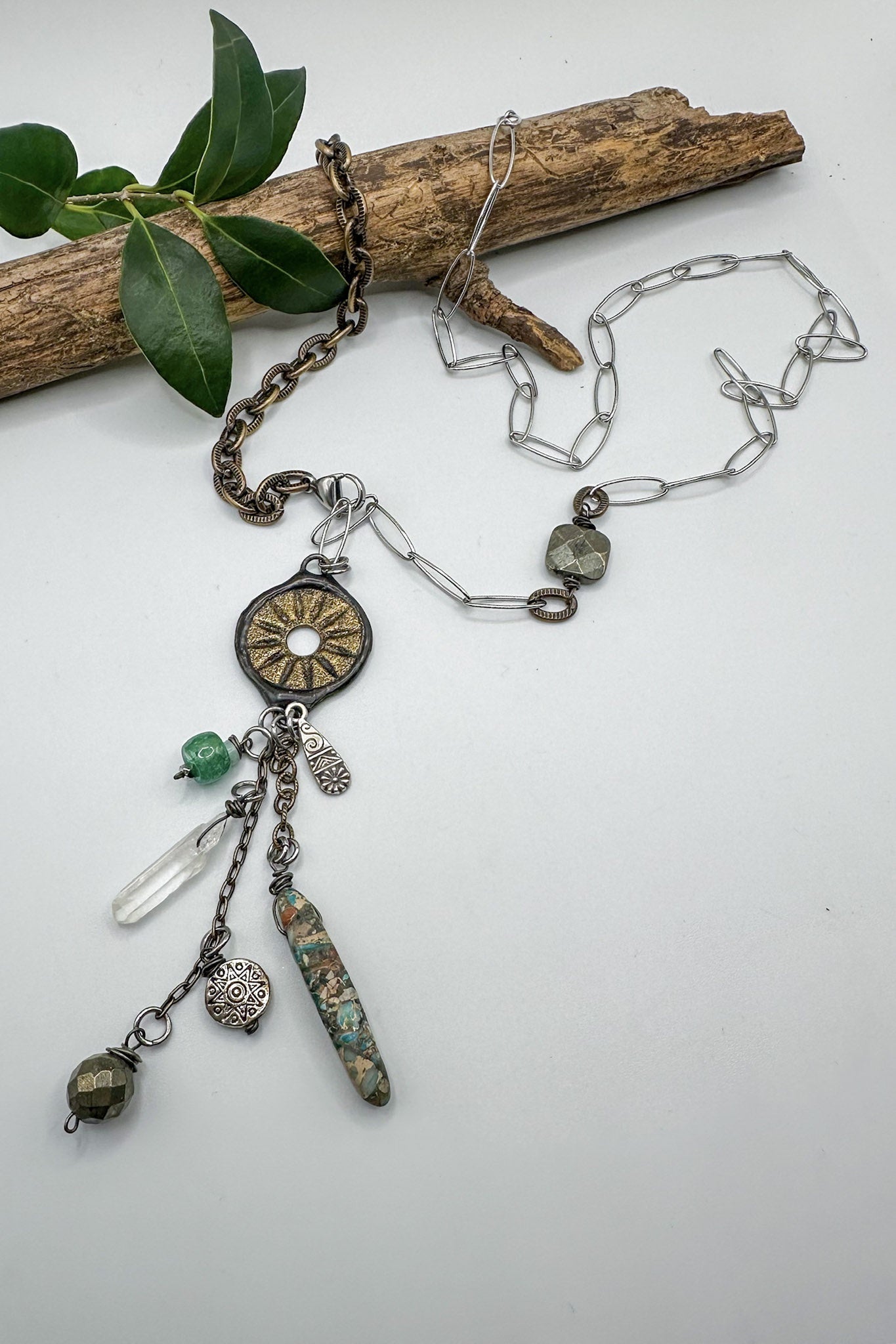 • An assortment of chain, wire wrapped gemstone, and mini bead charm drops.