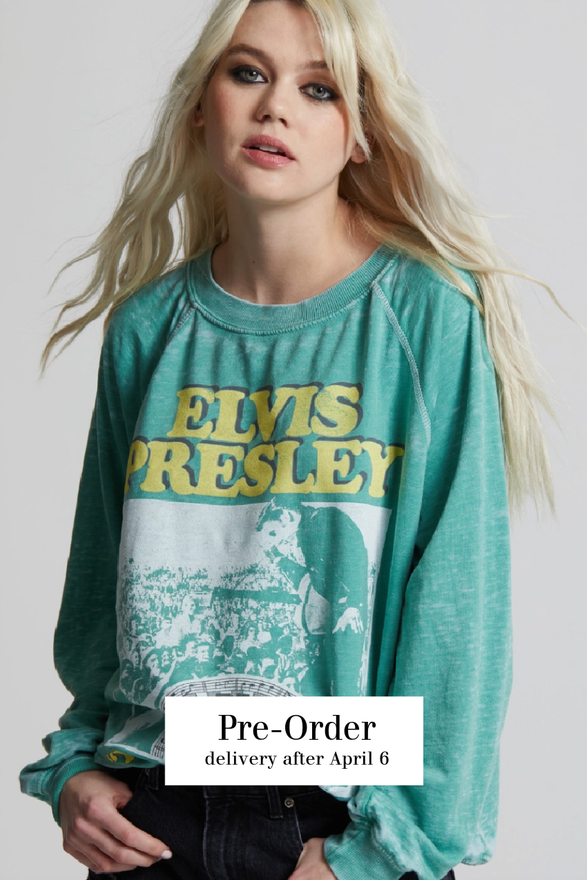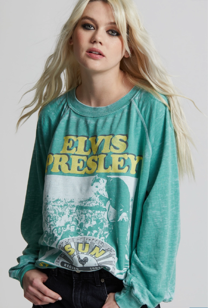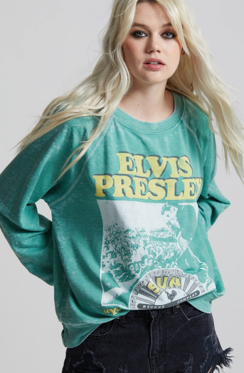 This Sun Records Elvis Burnout Sweatshirt in Dill Weed is the perfect stylish statement piece to add to your closet, and or any on-trend bohemian style outfit! Giving your look a beautiful element with it's fun "Elvis Presley" graphic design and raw edge detailing. This stylish and breezy top is the perfect piece for any time of year!