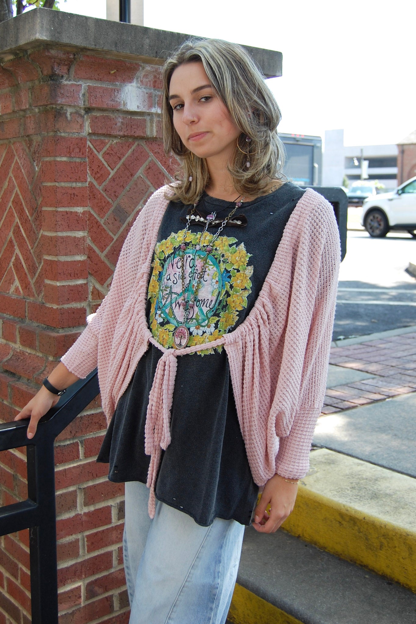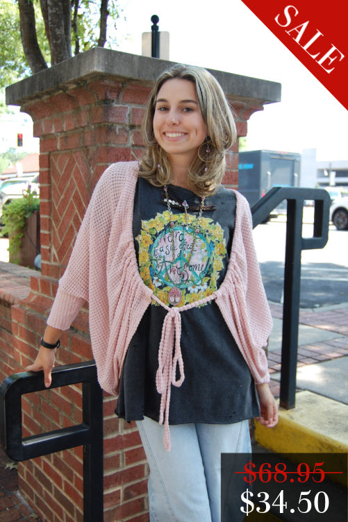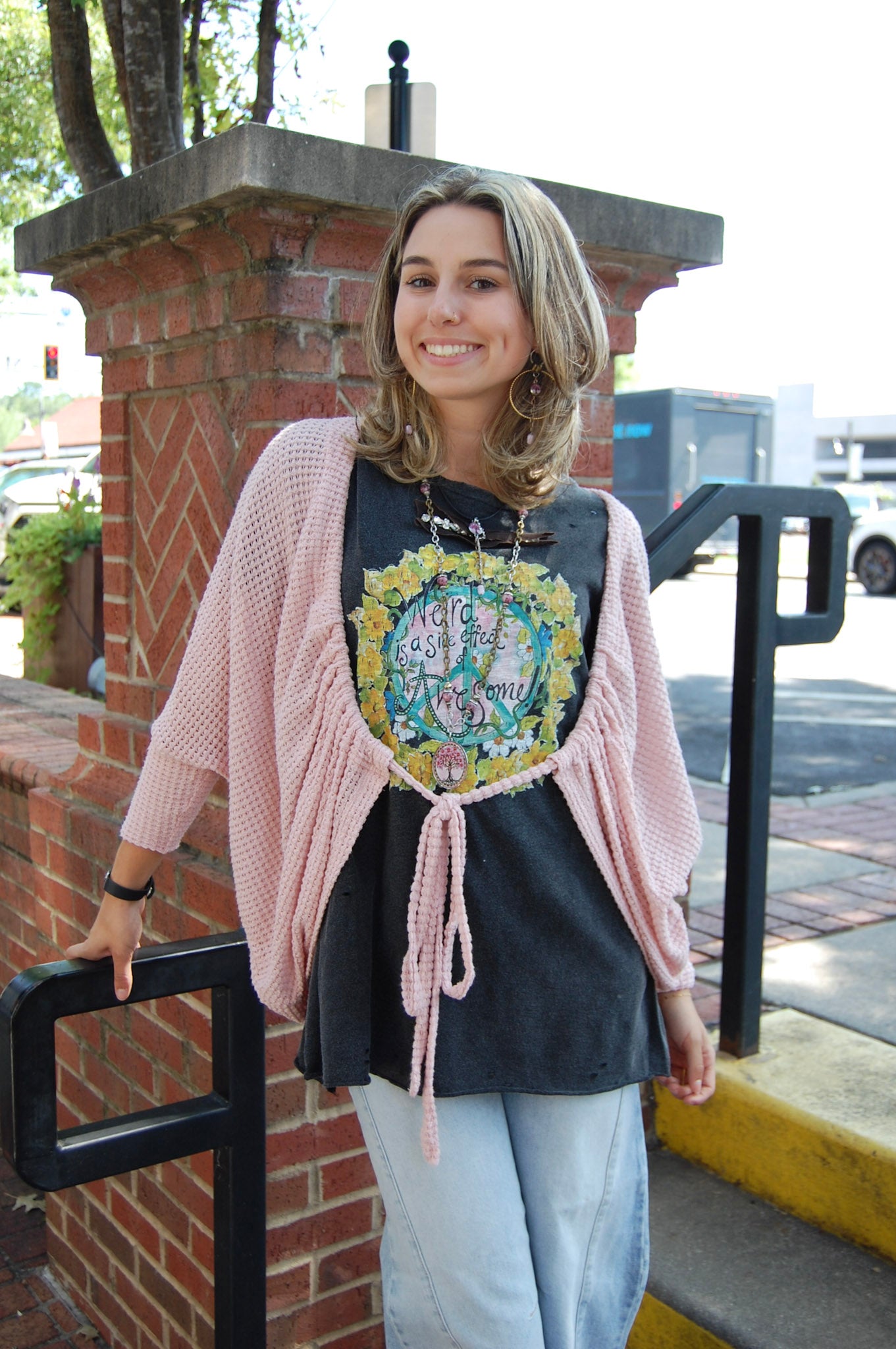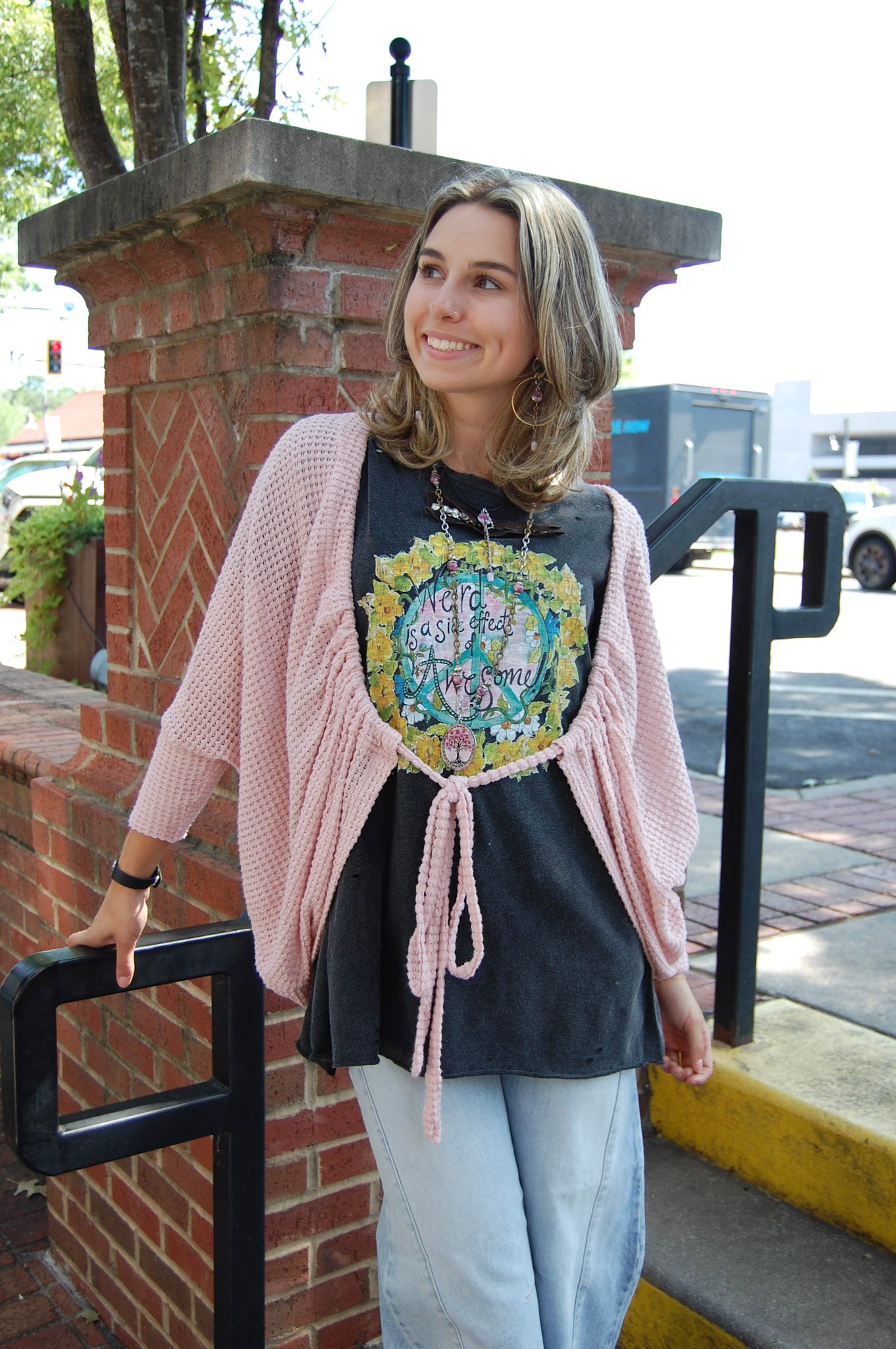 This Rosalie Ruched Cocoon Cardi in Pale Mauve is the perfect stylish cardigan to add to your closet, and or any on-trend bohemian style outfit! Giving you a light breathable fit and soft to the touch feel, this cardi accompanies a stylish and beautiful knit/popcorn fabric design, 3/4 length sleeves, and a tie closure for versatile styling. You can pair this cardigan over any top, tank, dress, or under any kimono and jacket for more coverage!