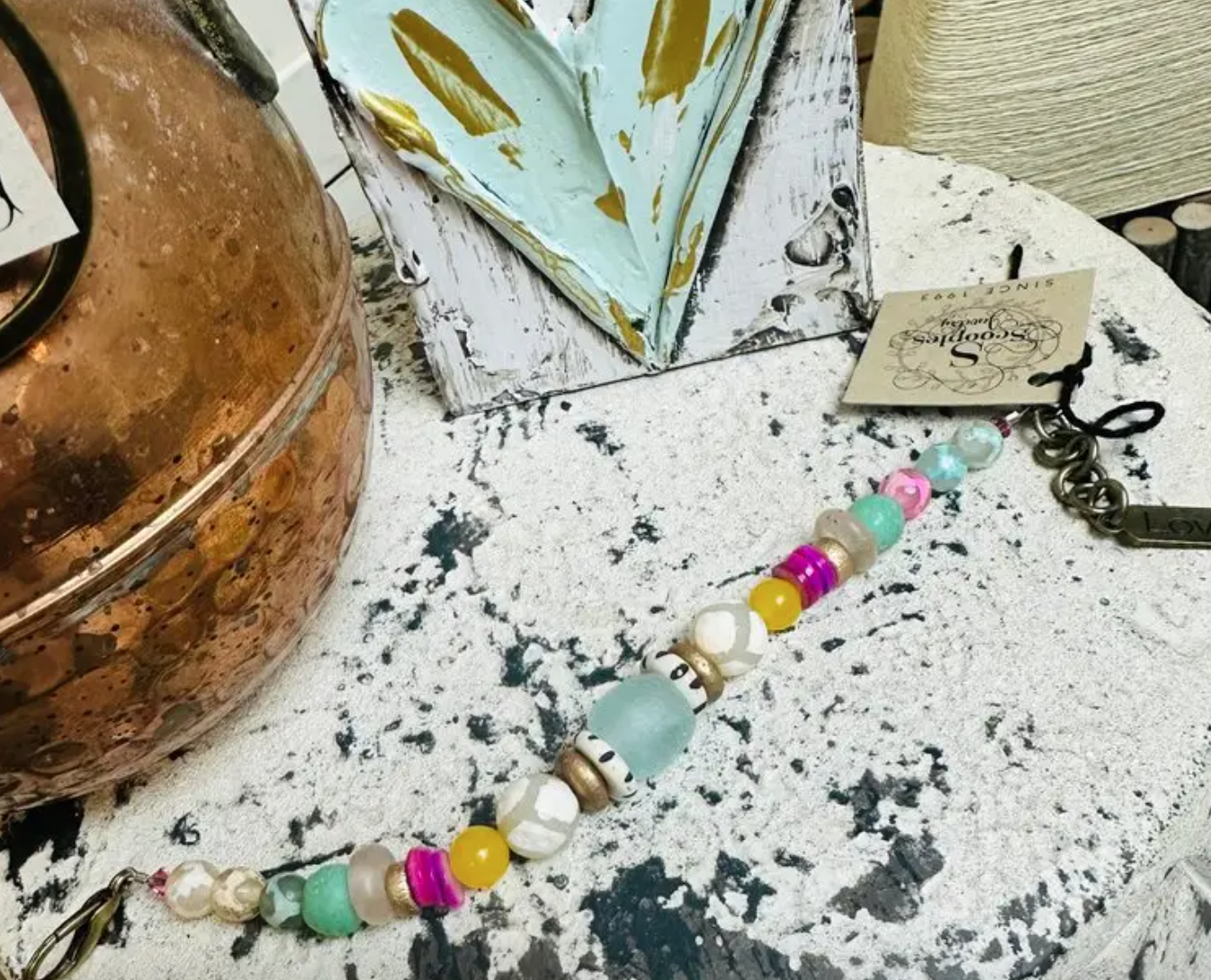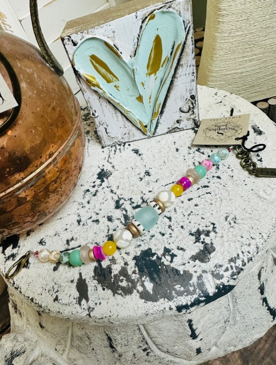 • Has Seaglass, shell beads, agate beads, dyed jade, gold wooden beads and the black and white bone bead that really gives it character.