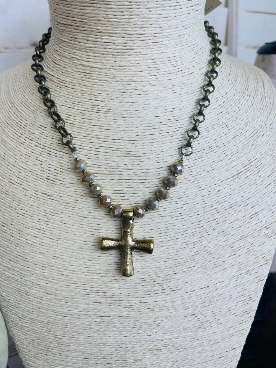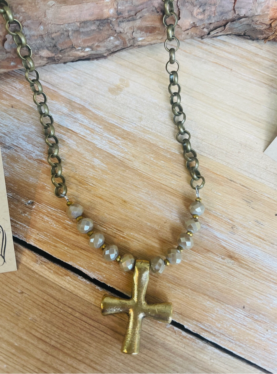 • At 19 inches, this special necklace comes with cashmere faceted crystals and small gold crystals. The cross pendant is a antiqued gold metal with a matte finish and is stunning.