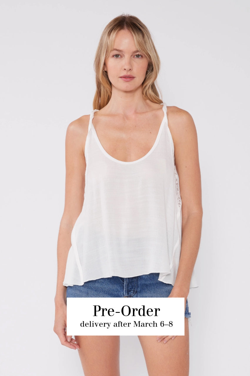This Selena Scoop Neck Twist Tank in Vanilla is the perfect stylish layering piece to add to your closet, and or any on-trend bohemian style outfit! Giving your look a beautiful element with its beautiful, lace texture, and soft fabric feel, this stylish and breezy tank is the perfect piece for any time of year!