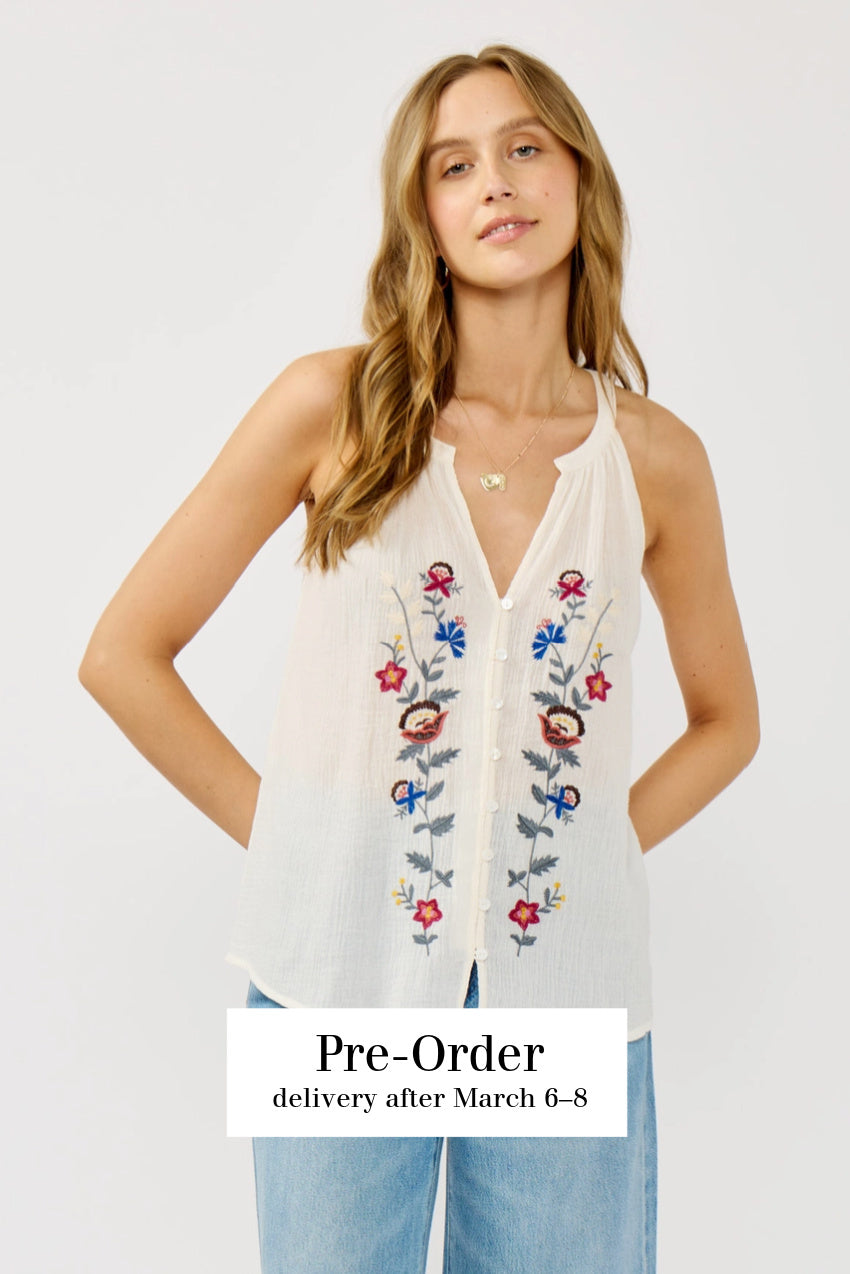 Andrea Embroidered Button Down Tank in Natural/Wine