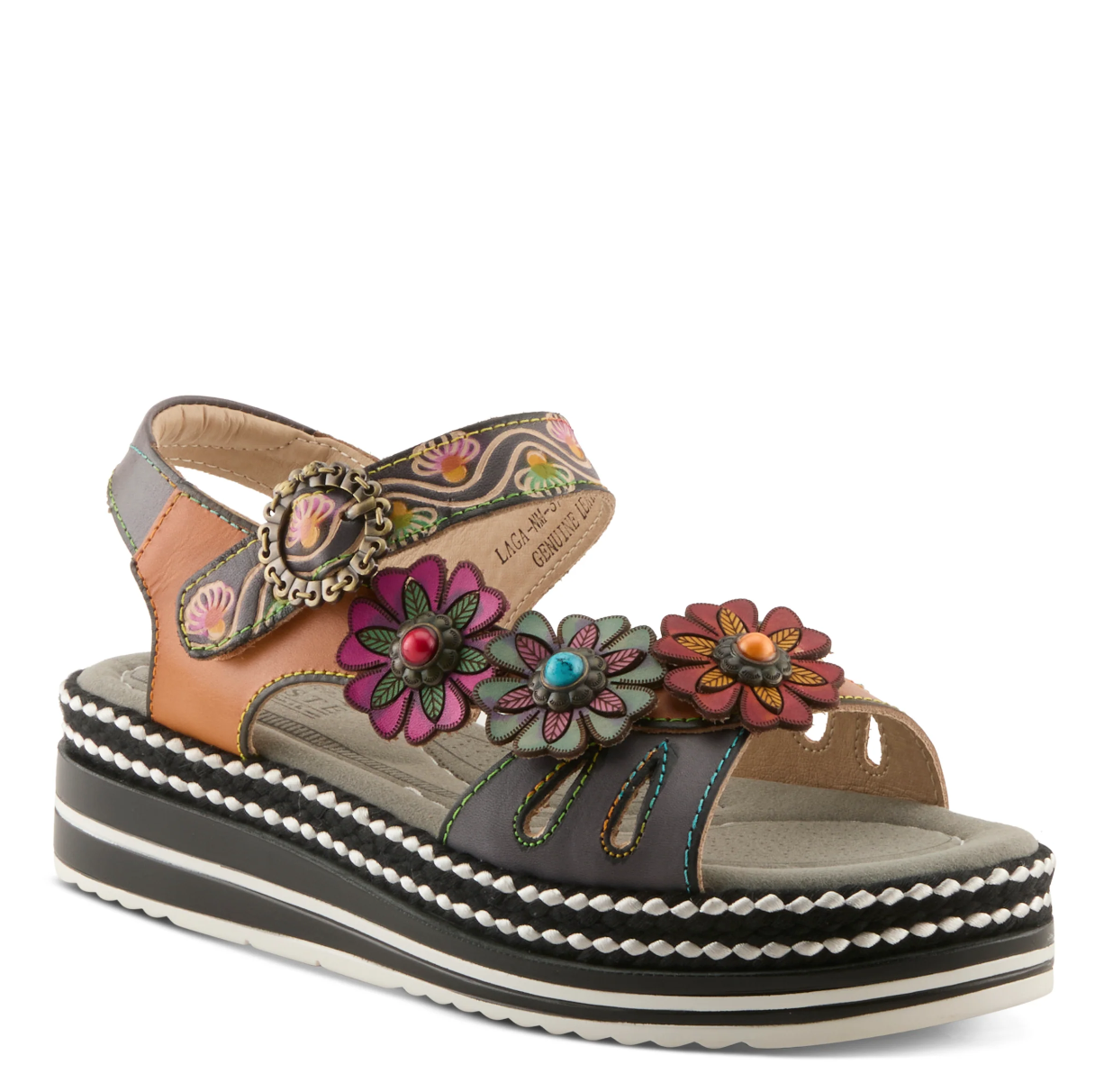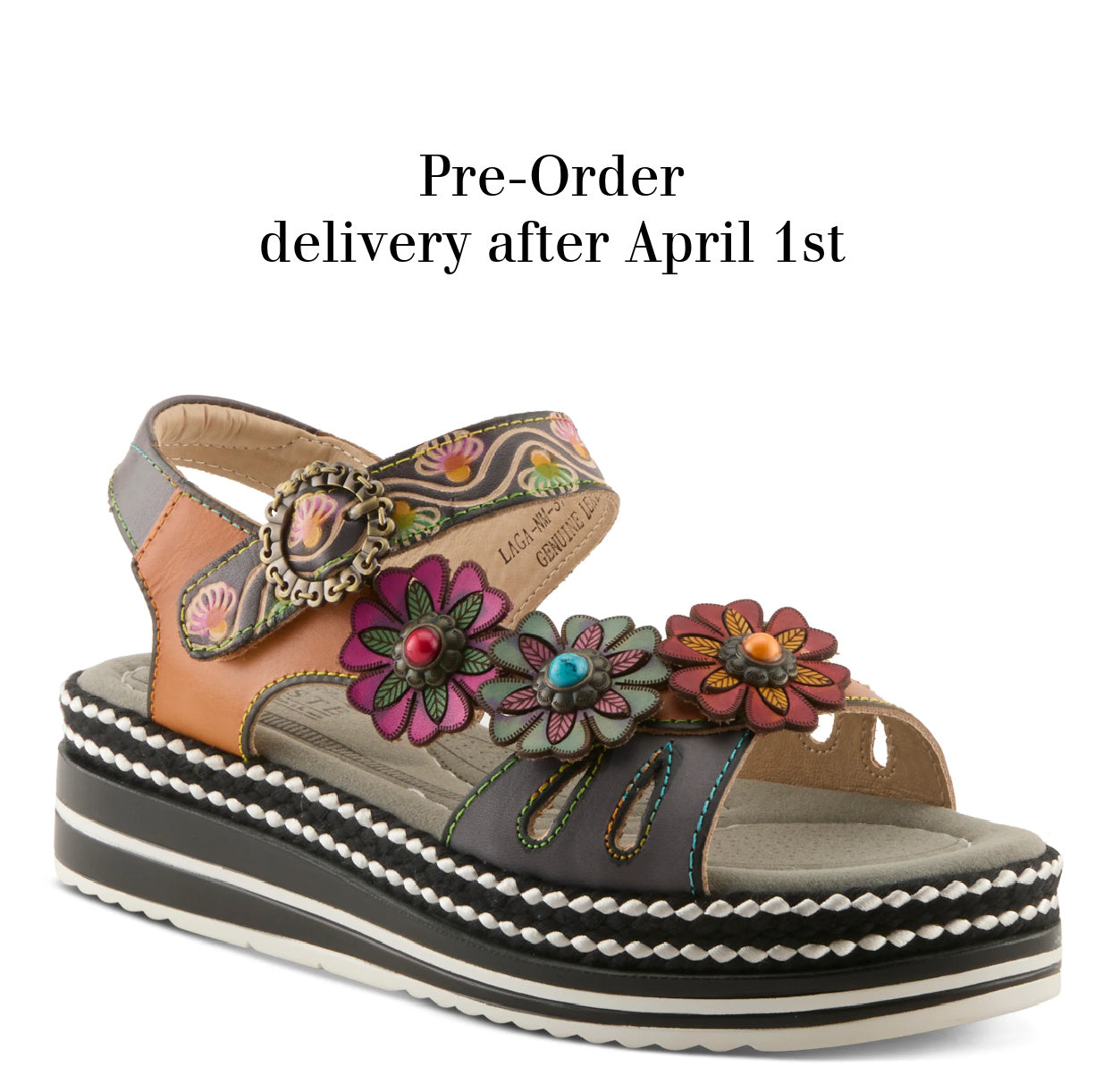 Super cushiony arch supported footbed with padded back strap and a trio of fun sexy leather asymmetrical center gemmed flowers up the front. Teardrop front cutouts, hand painted wavy hook&loop strap and a circular chain embellished buckle.
