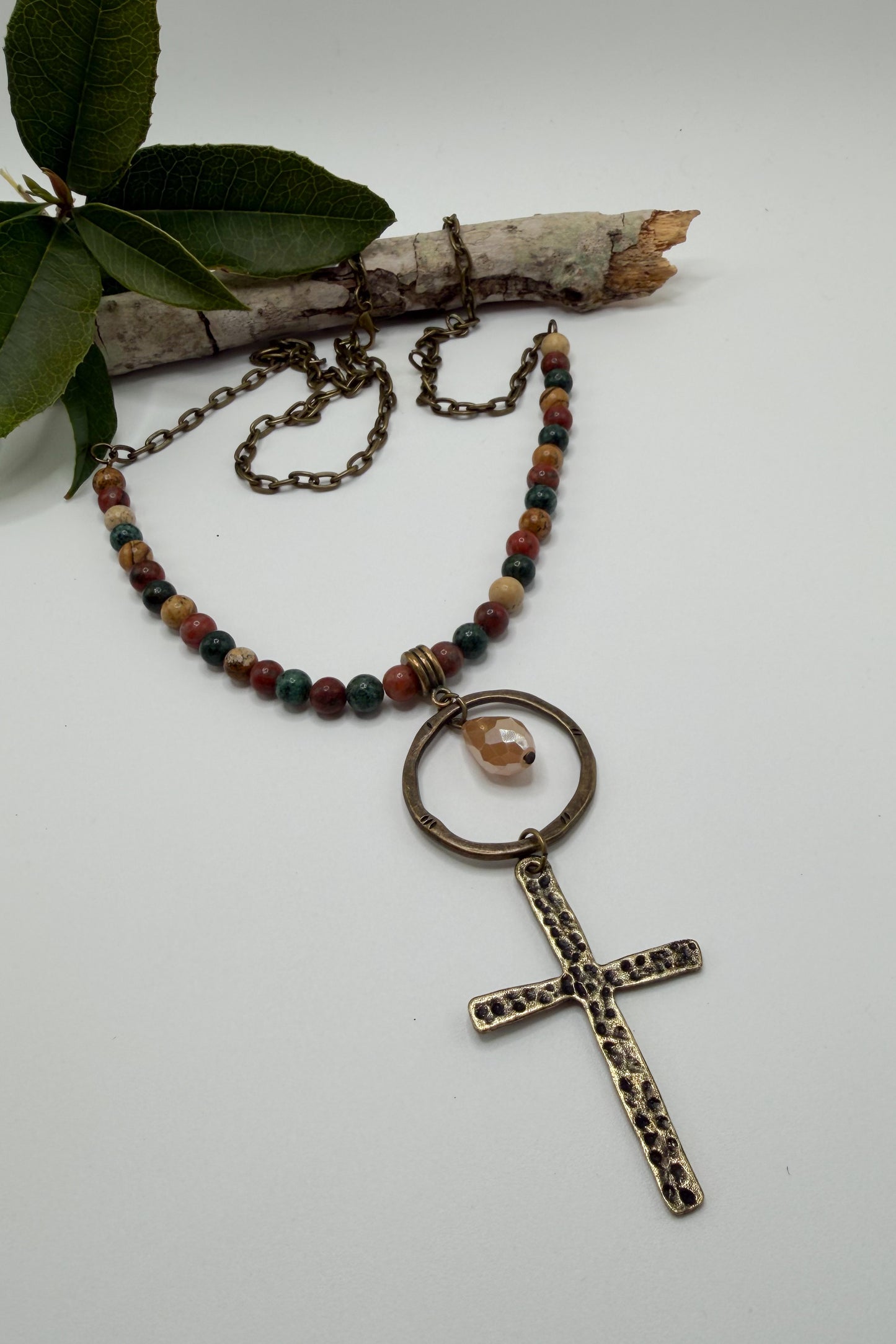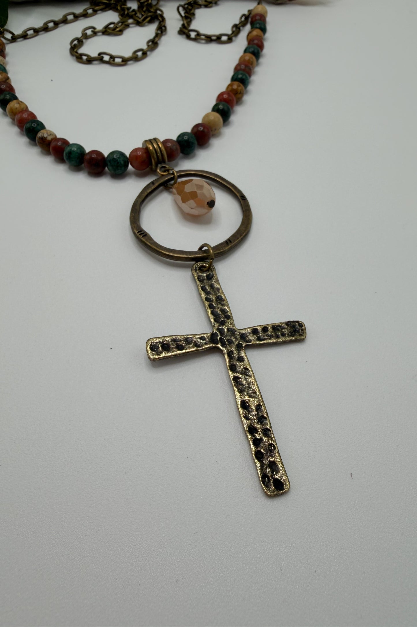 • A large brass o-ring, gemstone charm, and brass cross pendant.