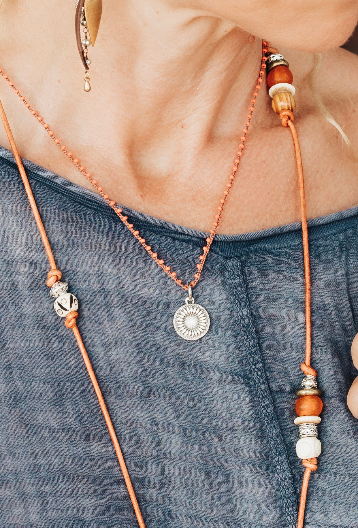 Our Crochet Sunflower Charm Necklace in Orange is a perfect and unique piece to add to any on-trend bohemian style outfit! With an 18-inch crochet beaded chain, and a half inch soldered sun pendant! This necklace will be sure to turn heads and add a one-of-a-kind touch to any look! Due to the handmade qualities, styles and colors may vary!