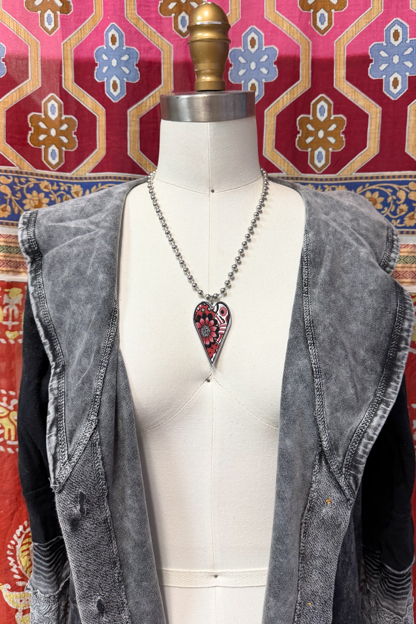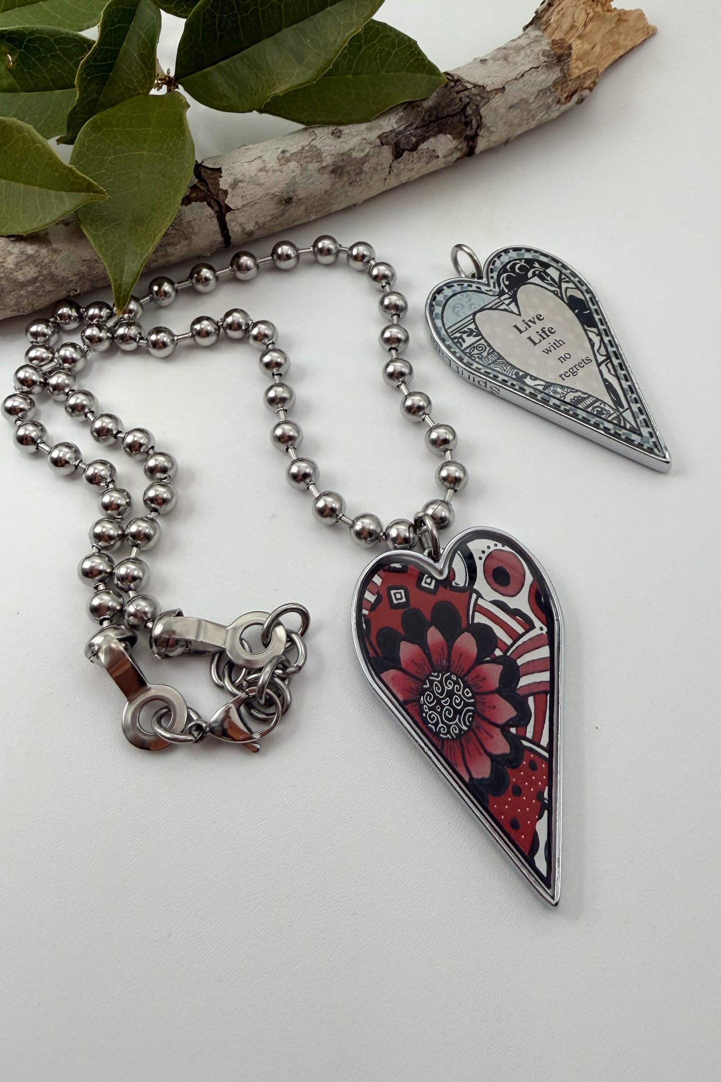 • A 2" long by 1-1 & 1/2" wide (including the stainless-steel jump ring) x 1/8" thick heart, hand resined, pendant.