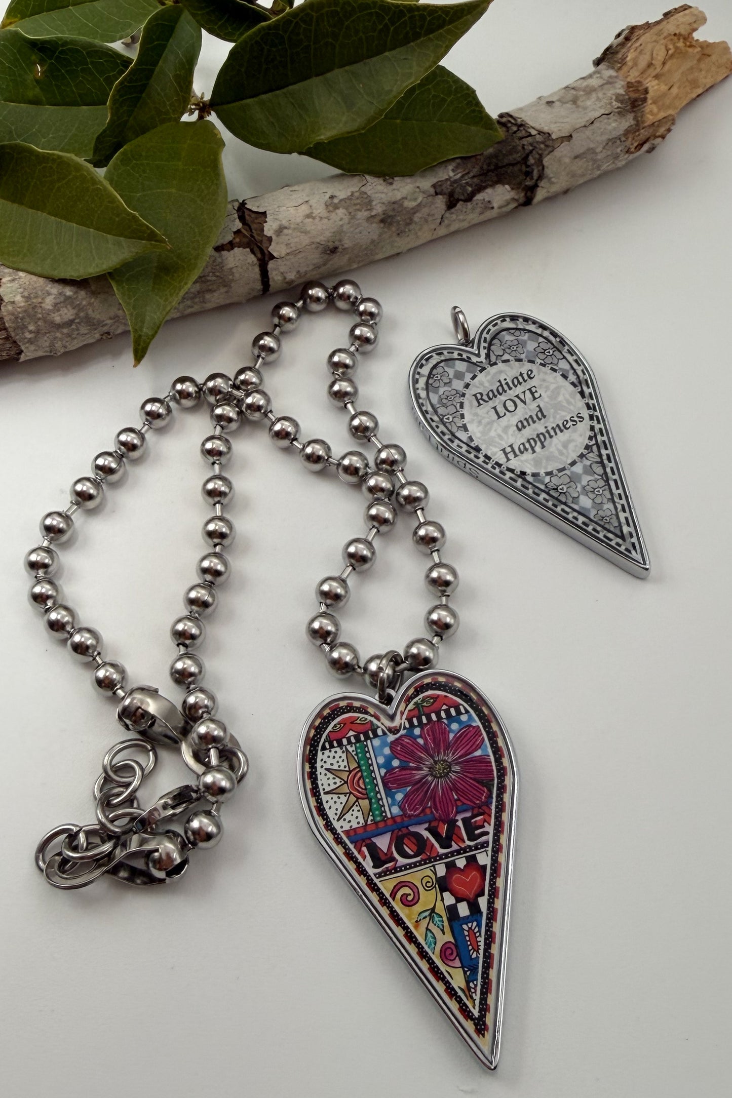 • A 2" long by 1-1 & 1/2" wide (including the stainless-steel jump ring) x 1/8" thick heart, hand resined, pendant.
