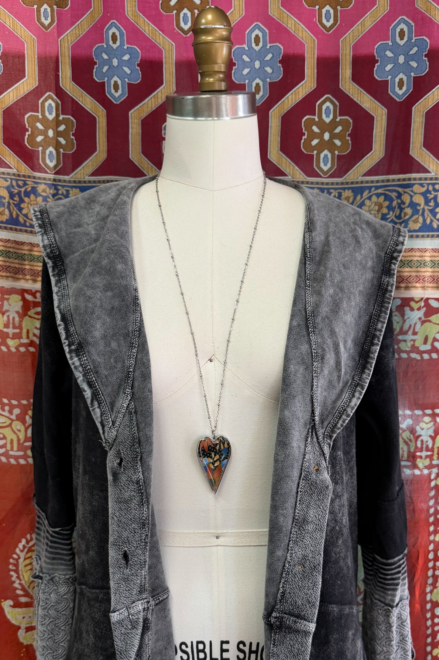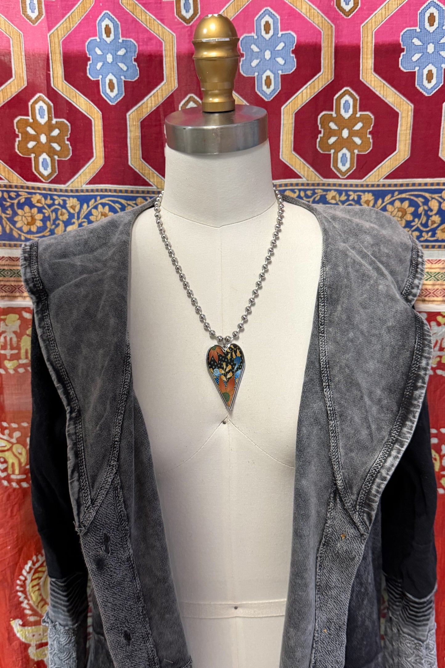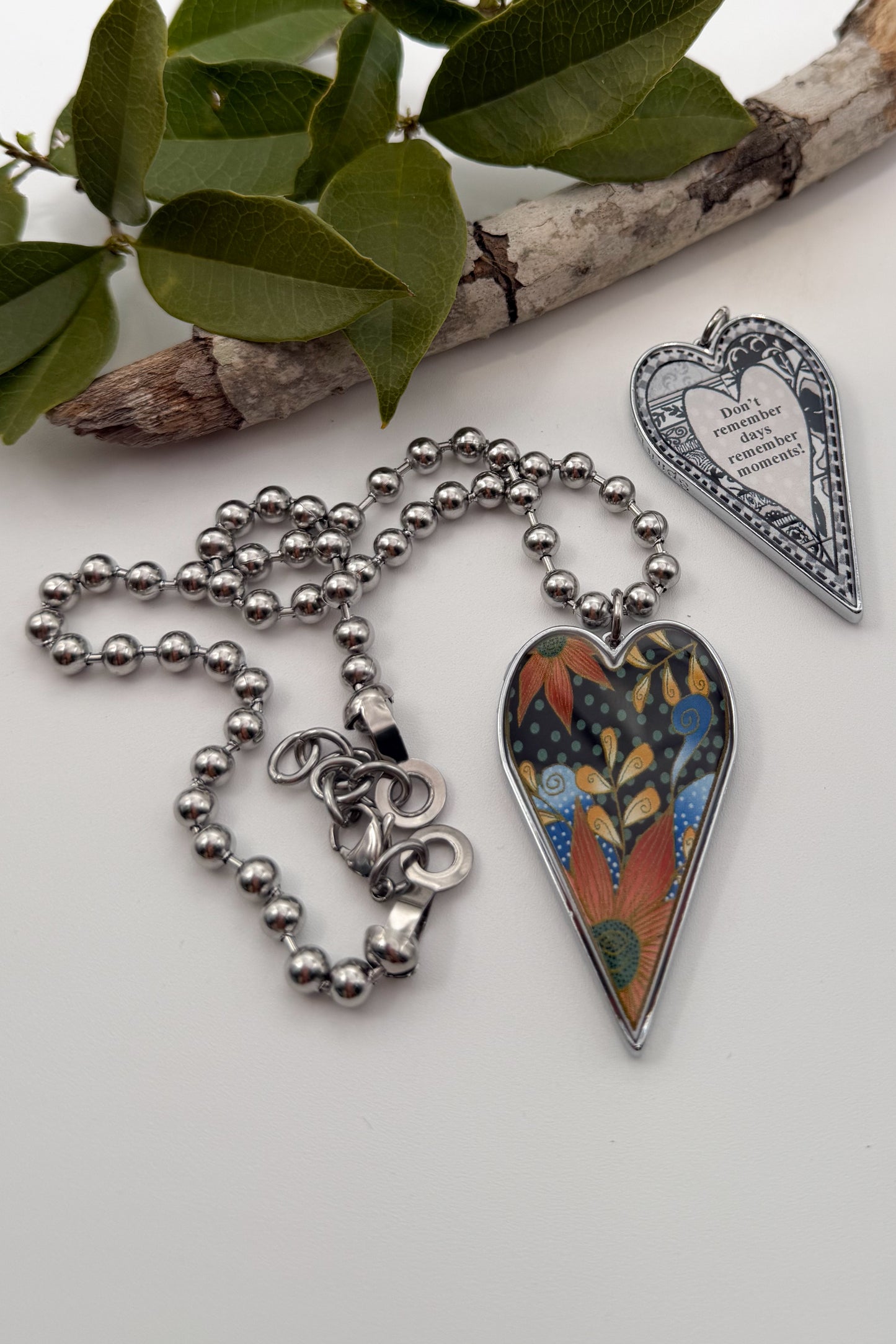 • A 2" long by 1-1 & 1/2" wide (including the stainless-steel jump ring) x 1/8" thick heart, hand resined, pendant.